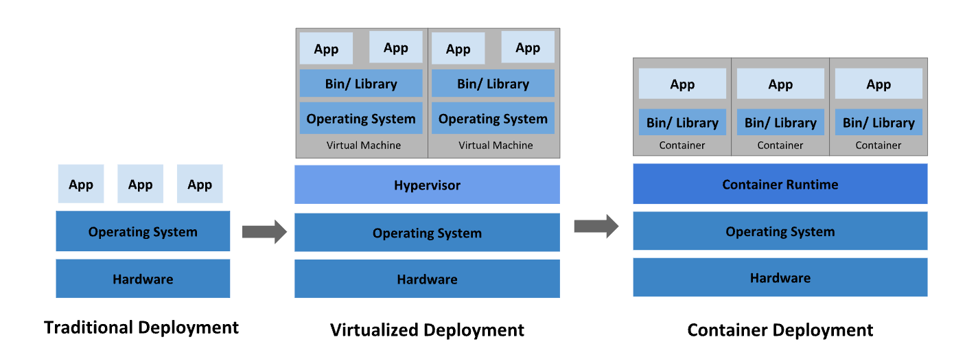 应用程序运行环境在Kubernetes崛起的过程中,也经历了从传统系统部署->硬件虚拟化系统部署->容器部署的过程。