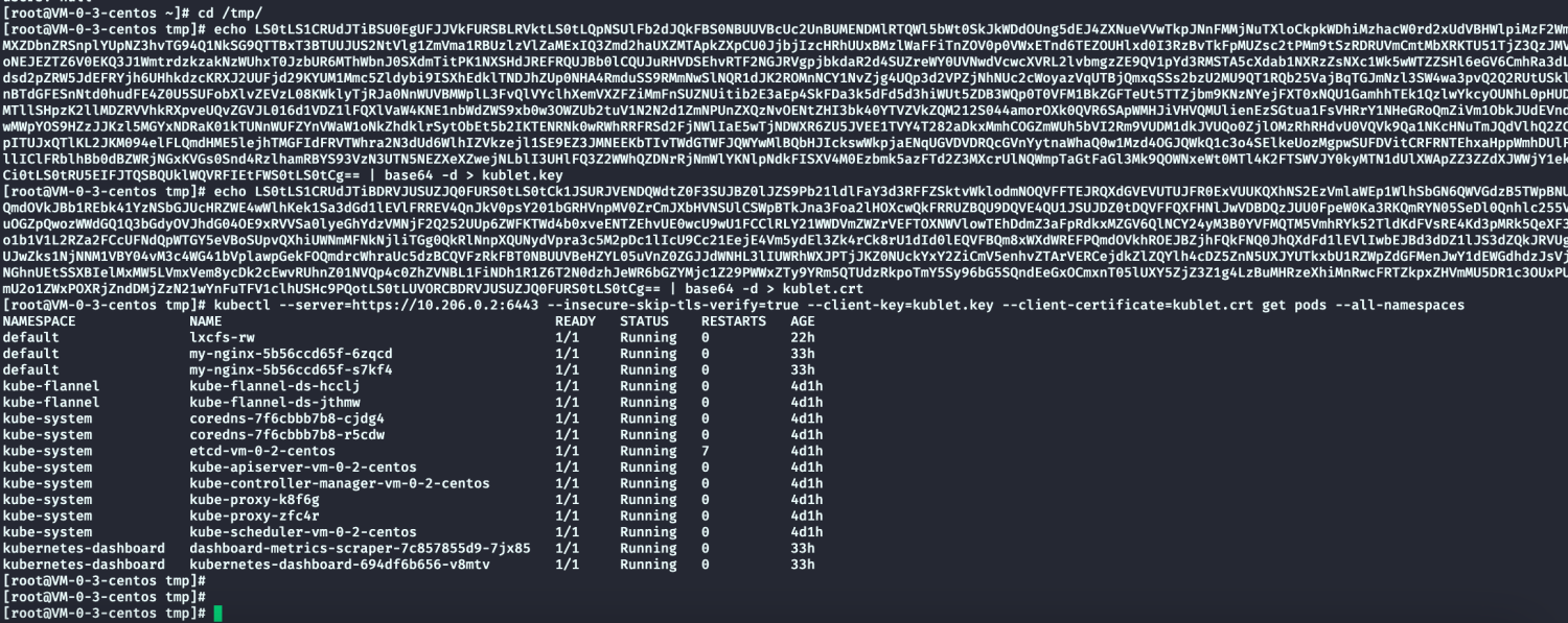 kubectl --server=https://10.206.0.2:6443 --insecure-skip-tls-verify=true --client-key=kublet.key --client-certificate=kublet.crt get pods --all-namespaces