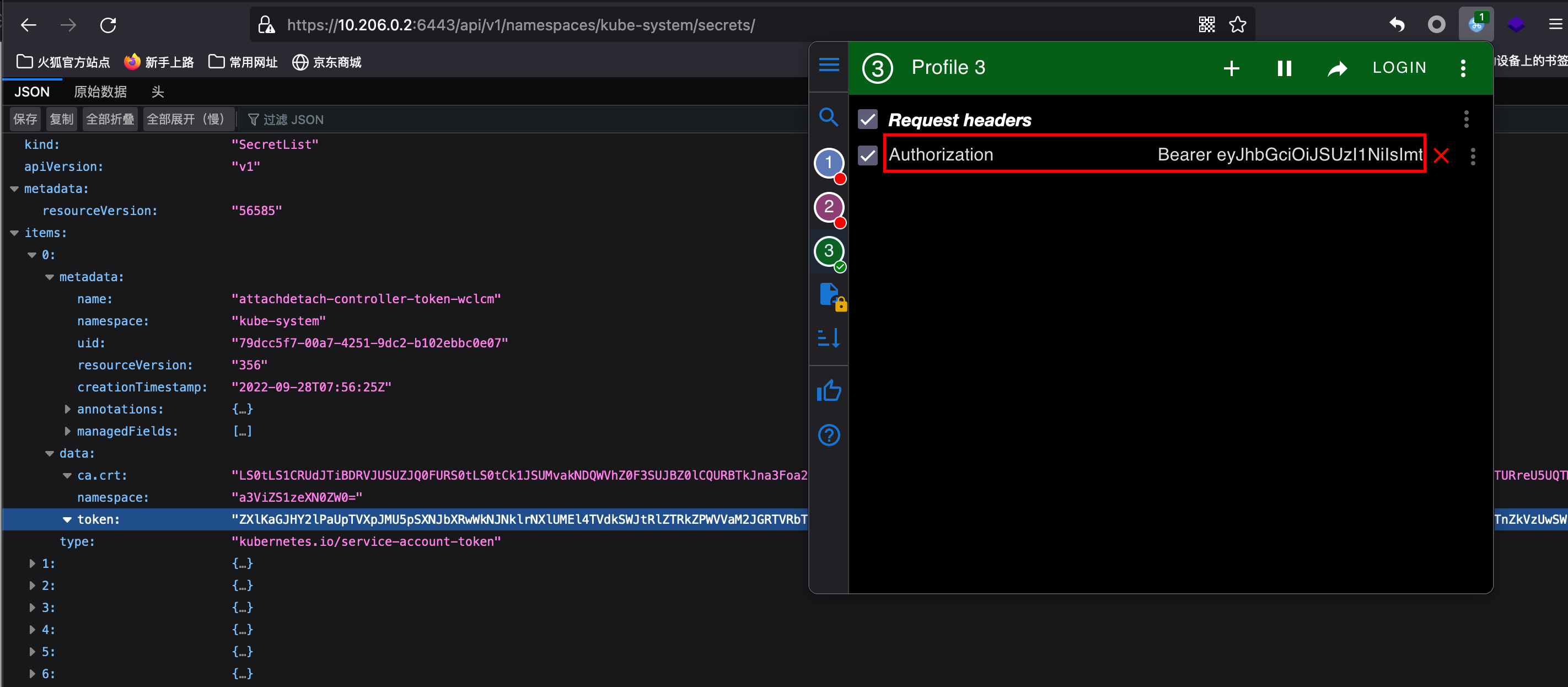 如图,在header中添加高权限的ServiceAccount token值,通过API server的身份认证后,读取敏感信息:
