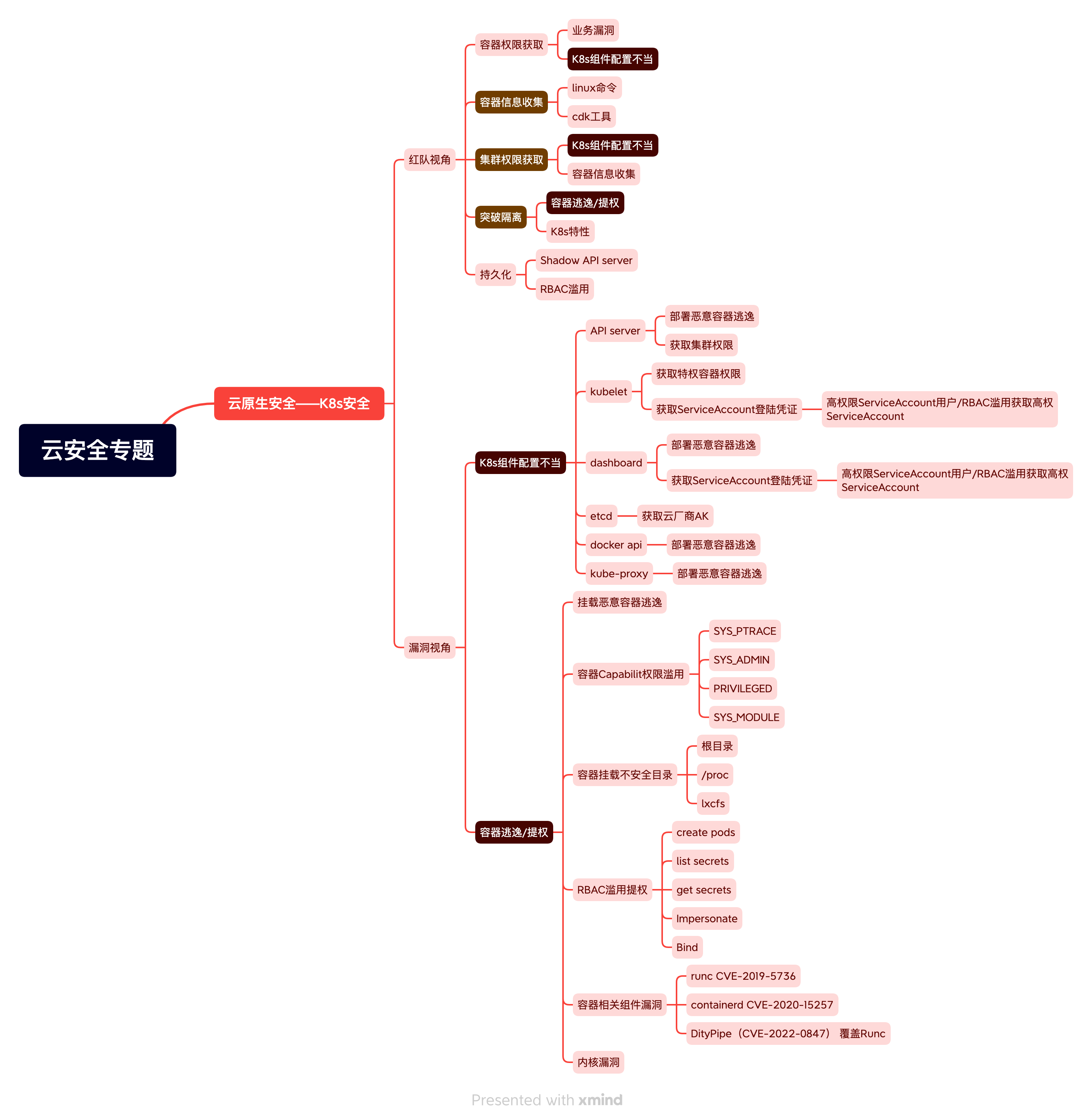 针对K8s安全,我从红队视角和漏洞视角两个维度出发,列出了一些可能用到的知识点。在后续的研究过程中,不当不足之处,会进行更新补充,如下为V1.1版本: