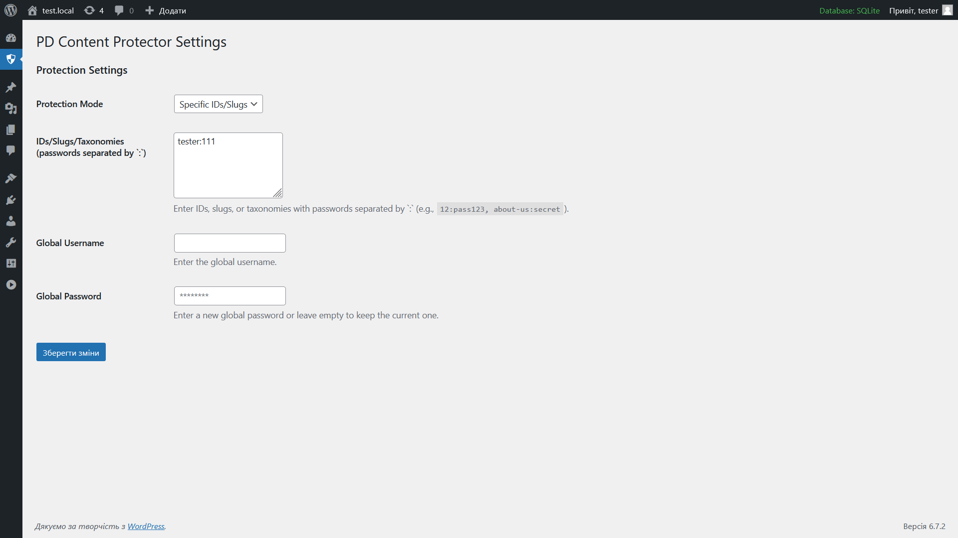 Global Mode: The entire site is protected using a specified global username and password.