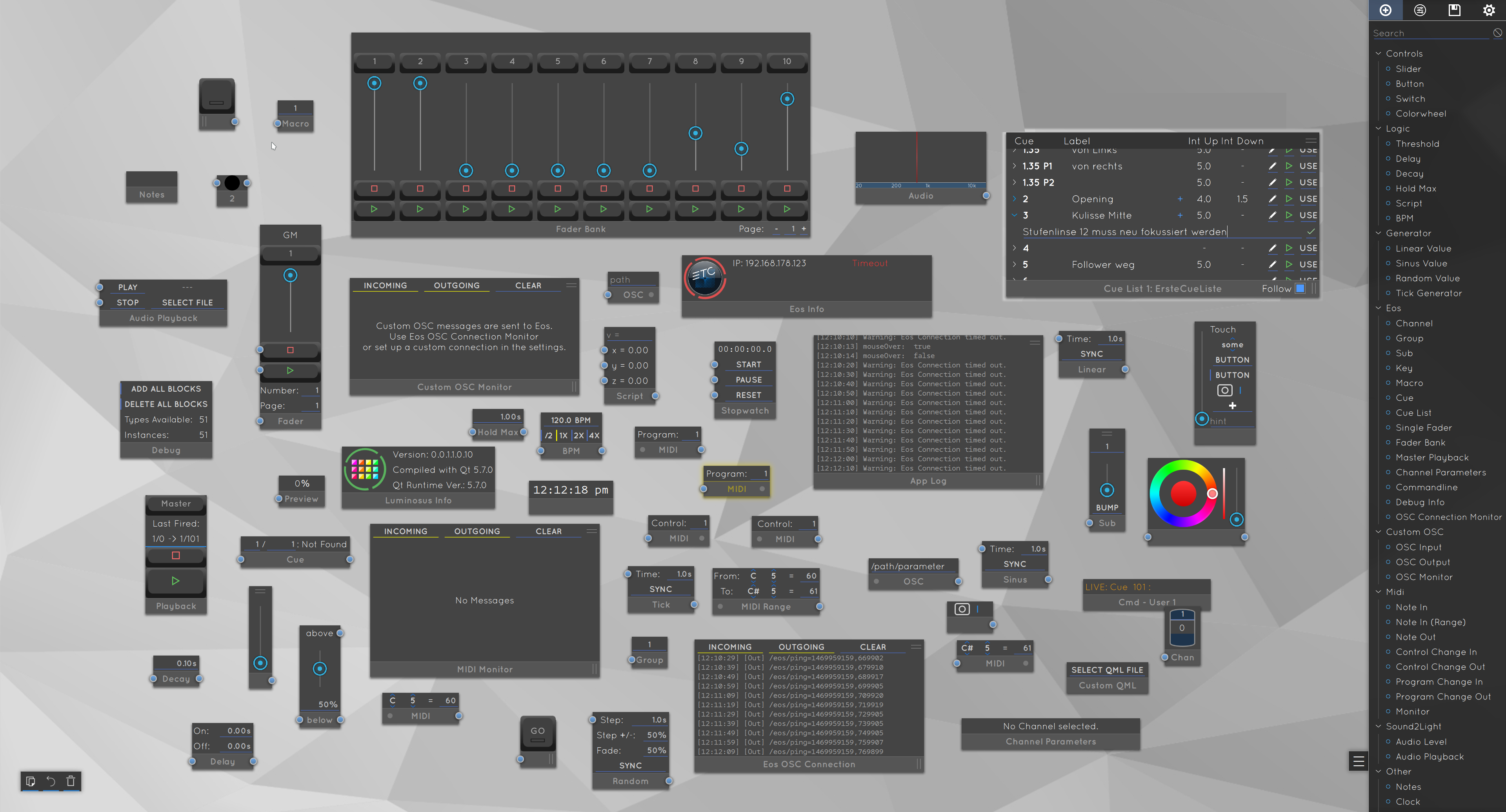 Luminosus (ETC Eos Edition) is the project title for a "companion app" for consoles of the ETC Eos family. It can display and edit cue list, fire and react to cues and show fader banks including their labels. It is possible to trigger music playback on specific cues and there are simple effects and Sound2Light features that can easily be connected to the consoles functions like channels, submasters or groups. It can also convert MIDI Note-, Program- and Control-Change-Messages to OSC commands.