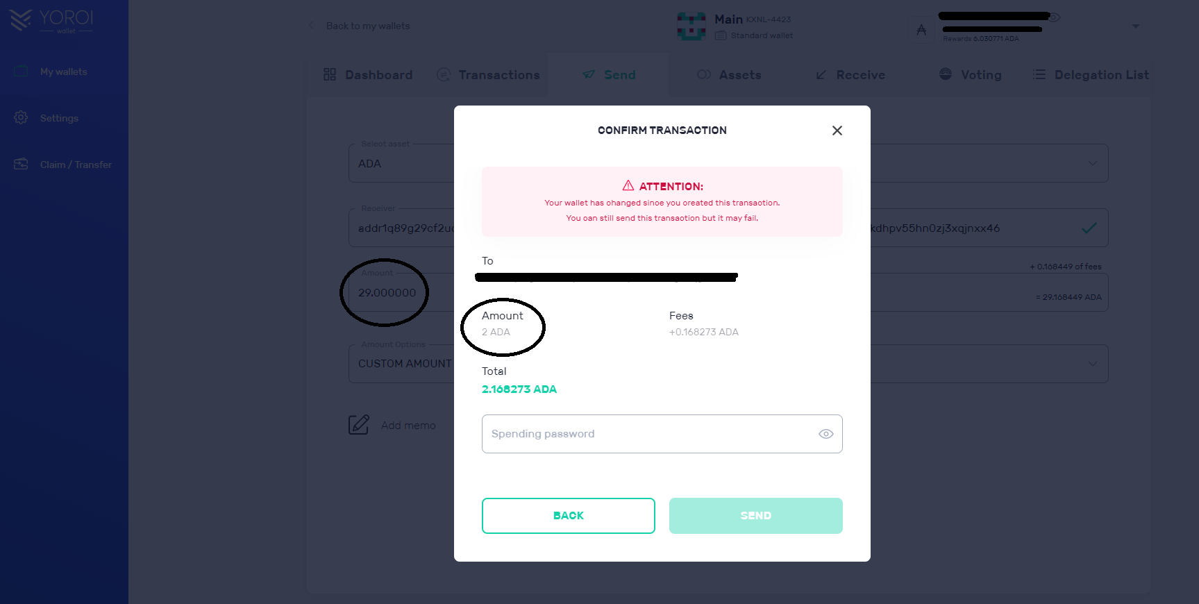 Sometimes if you click "Send" immediately after Yoroi calculates fees, the next popup omits a number from your send amount.