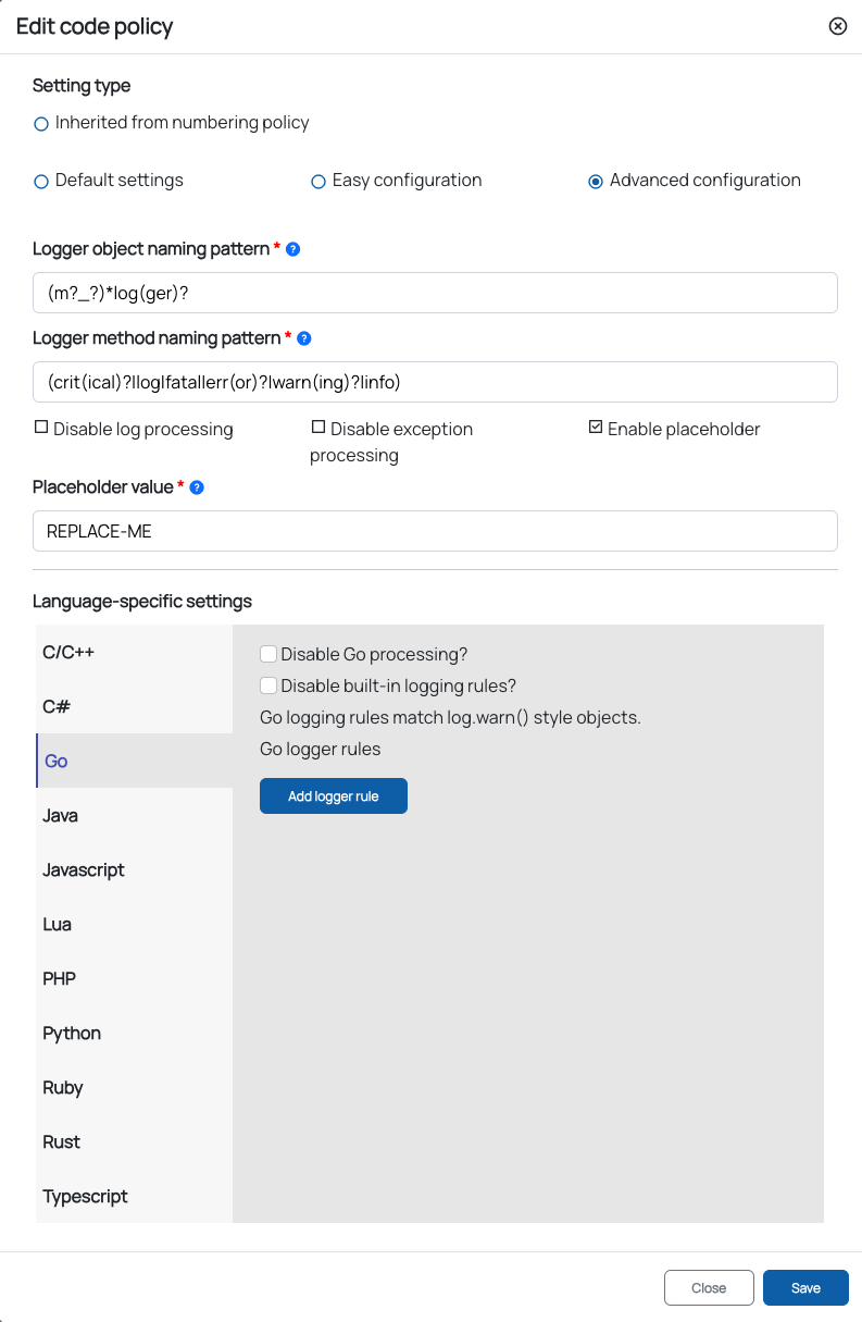 Yes. On can define a custom Placeholder in the "Code Policy settings" of a project. The agent will pick-it-up and automatically insert error codes.