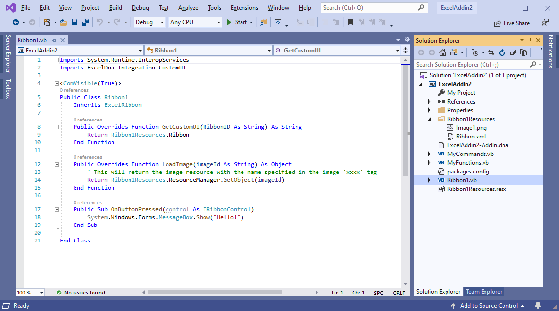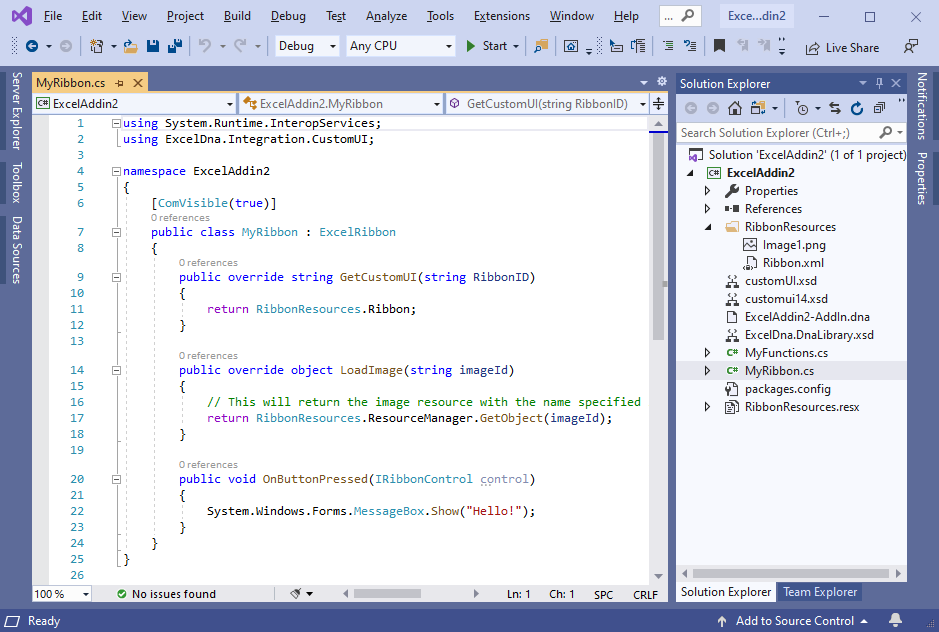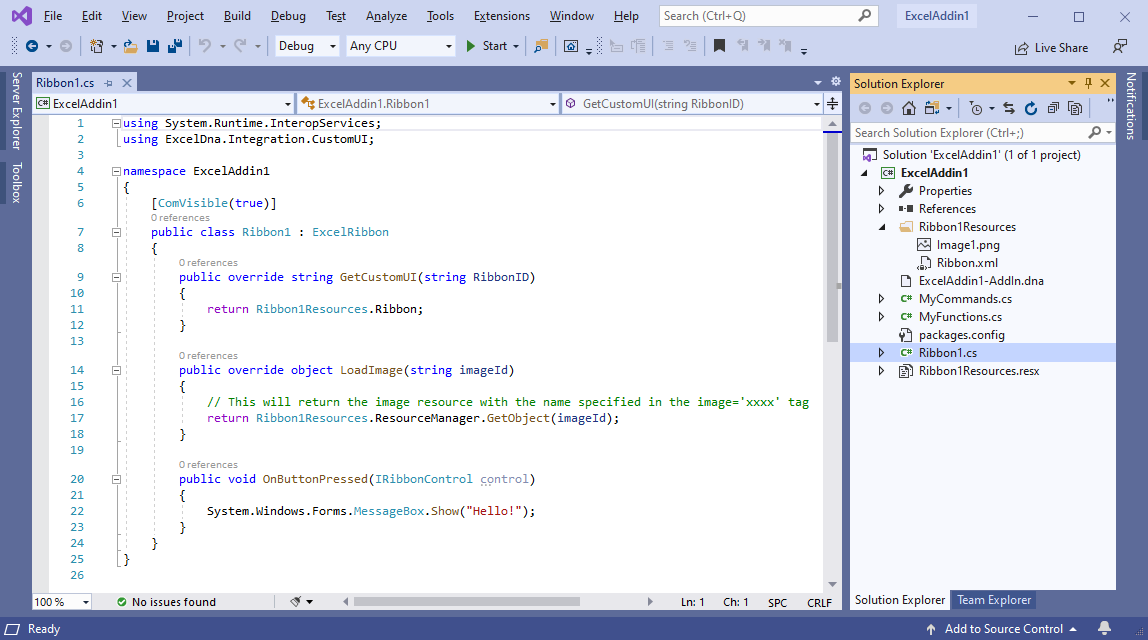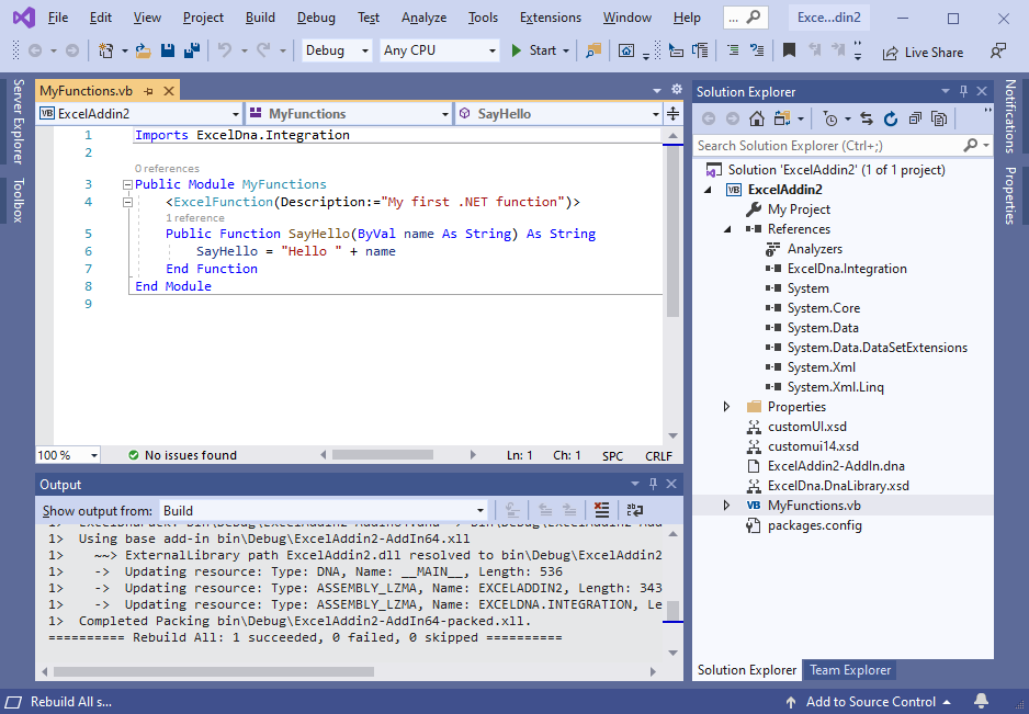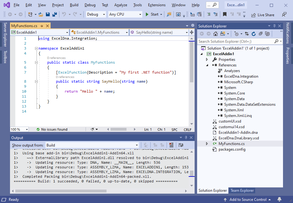Creating a project from a template includes exceldna.addin and exceldna.integration packages, SayHello sample function and XML schemas:
