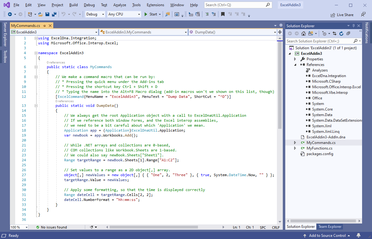 Added the ExcelDna.Interop NuGet package and added a command example to the project templates: