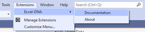 Added an "Excel-DNA" submenu under the Extensions menu with Documentation and About items: