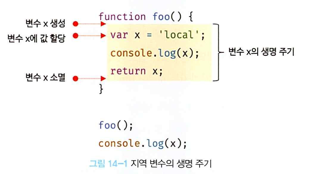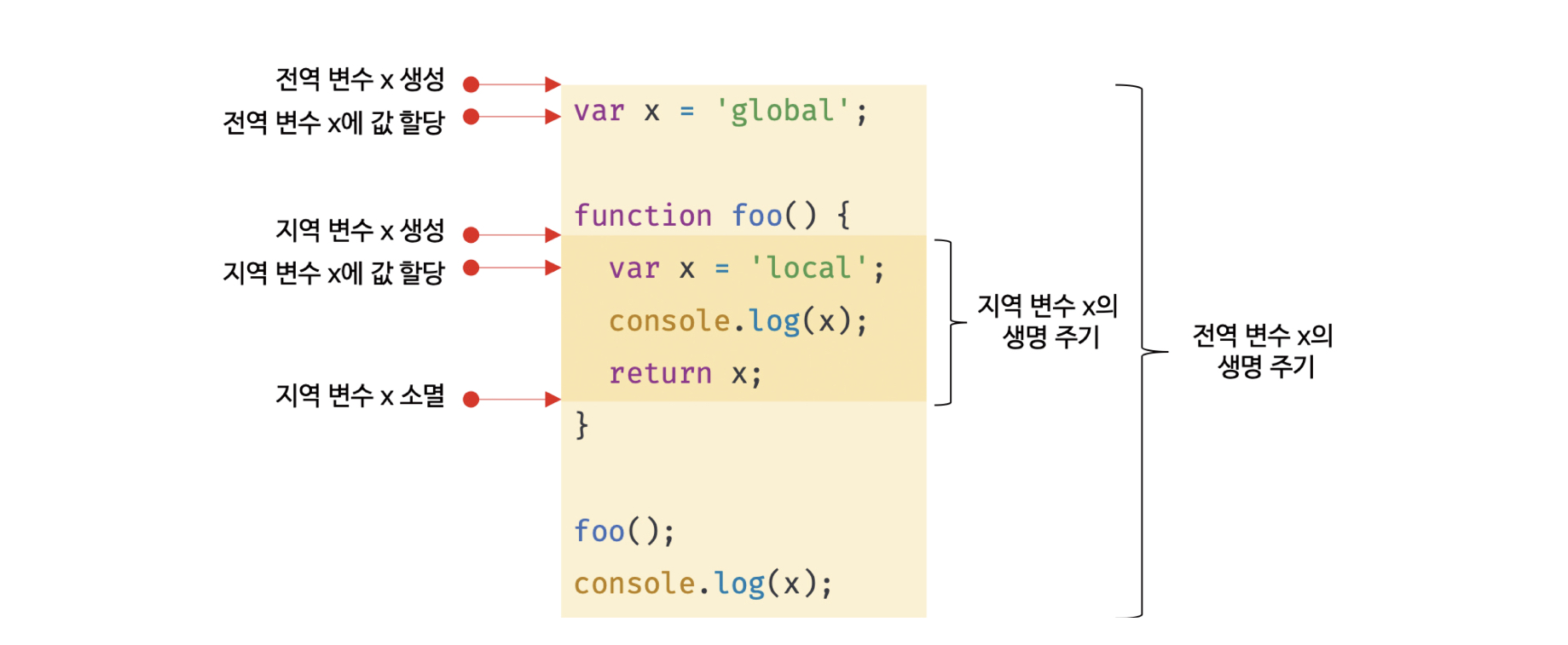 - 변수는 선언에 의해 생성되고 할당을 통해 값을 갖는다. 변수에 생명 주기가 없으면 한 번 선언된 변수는 프로그램 종료하지 않는 한 영원히 메모리 공간을 점유한다.