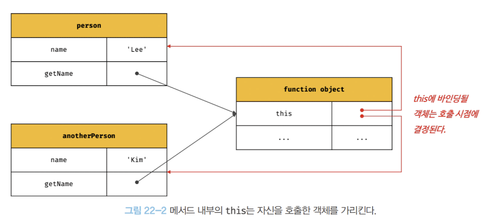 - this는 엔진에 의해 암묵적으로 생성되고 어디서든 참조 가능하다. 함수 호출 시 arguments 객체와 this가 암묵적으로 함수 내부에 전달되어, 함수 내부에서도 arguments 객체를 지역변수처럼 쓰는 것과 같이 this도 사용 가능하다. 👉 this 바인딩(this가 가리키는 값)은 함수 호출 방식에 의해 동적으로 결정됨.