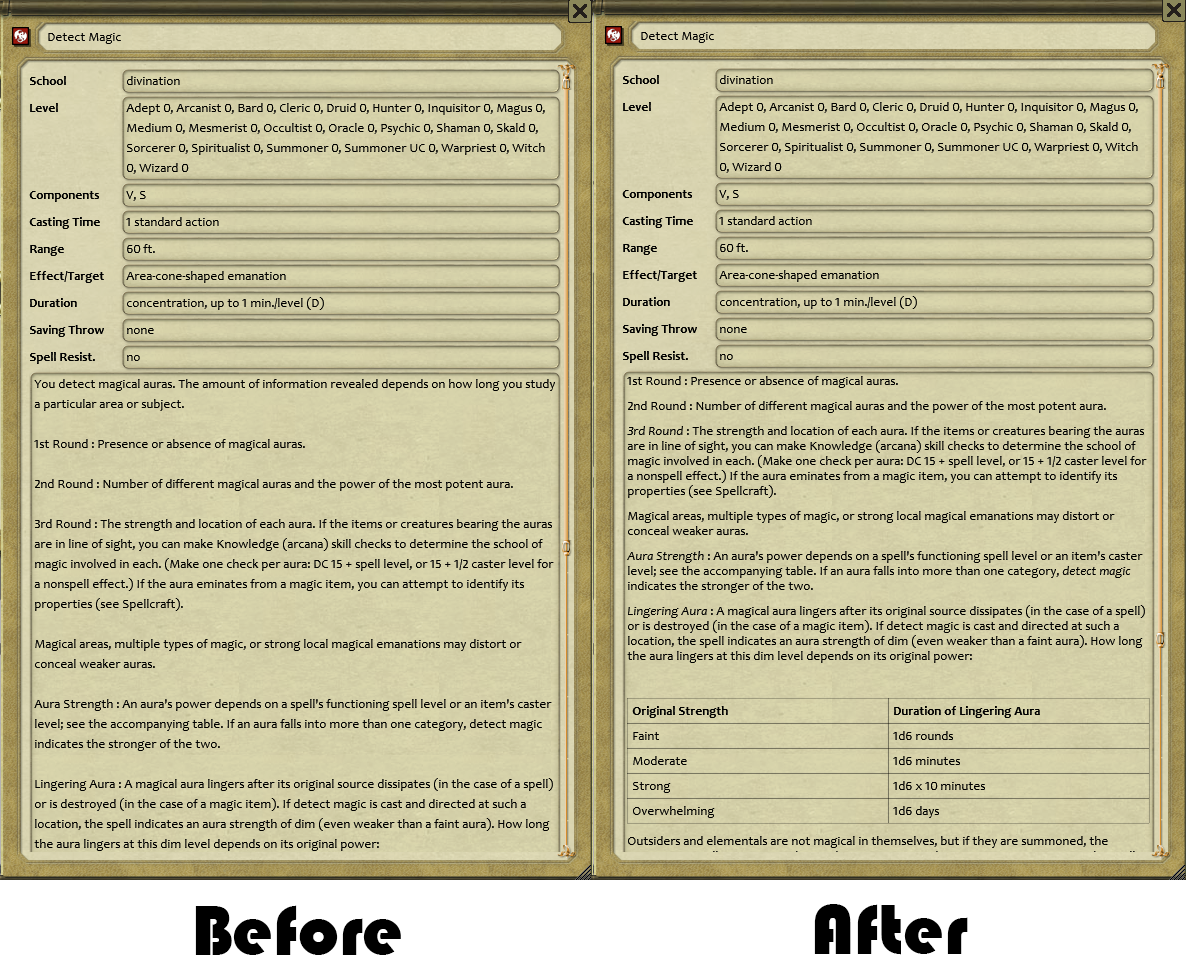 This extension modifies the character-specific copies of spells (accessed via their actions tab) to allow fully-formatted descriptions including italics, tables (detect magic is a great example), links, etc. At this time, you need to drag the spells into actions after installing this extension for the special formatting to be included.