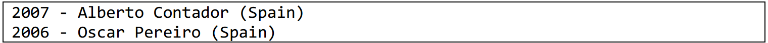 - Un tipo base llamado Ganador que representa el ganador de una edición de una carrera ciclista;