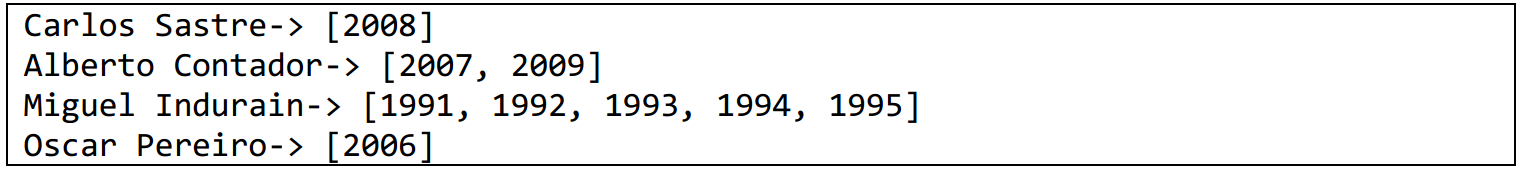 - void guardaGanadoresNacionalidadConAnyos(String nombreFichero, String nacionalidad): Toma como parámetros el nombre de un fichero, y una nacionalidad. Genera un fichero con los ganadores de esa nacionalidad y los años en los que ganaron la carrera. El formato del fichero resultado se muestra en la Figura 2.