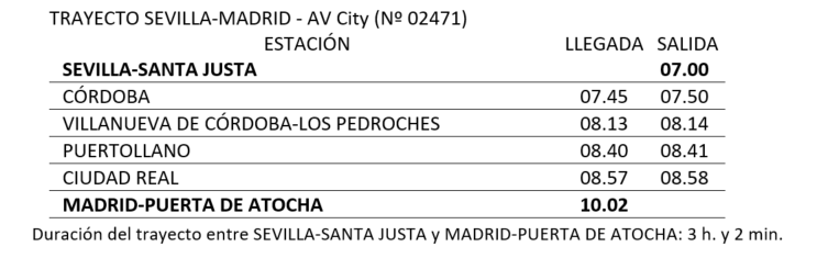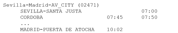 - Estaciones, de tipo List, consultable. Contiene los nombres de las estaciones en las que para el tren. El orden en la lista se corresponde con el orden de las estaciones en el trayecto. Para el ejemplo anterior, el primer elemento de la lista sería SEVILLA-SANTA JUSTA y el último MADRID-PUERTA DE ATOCHA.