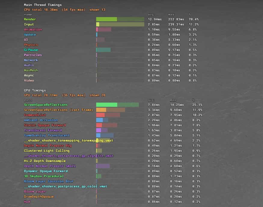 Fixes timing scopes to more accurately represent a per-frame main thread breakdown, and prevents spikes when GC is executed. - **GcPause** - New separate timing scope showing time spent in GC per frame - GC pause time is subtracted from all other scopes, so each scope now only tracks its own code execution and no longer includes GC overhead - e.g. when GC occurs during the audio scope, the audio scope no longer spikes to 20ms - **AudioMixingThread** removed from the main scopes - Runs on a separate thread, so its timings are effectively meaningless in the main thread view - All other scopes are main thread only - No longer relevant given the audio optimisation work done over the past months - **Scene** scope removed - Didn't make much sense as it was an aggregate wrapping many other timing scopes - Replaced with a finer `Update` scope that tracks `Component.FixedUpdate`/`Update` - **Editor** scope no longer shows in-game - Scopes reschuffled - e.g. verlet rope physics traces are now tracked under the physics scope - Audio occlusion queries are now tracked under the audio scope https://files.facepunch.com/lolleko/2026/March/02_12-59-QuixoticMarten.png