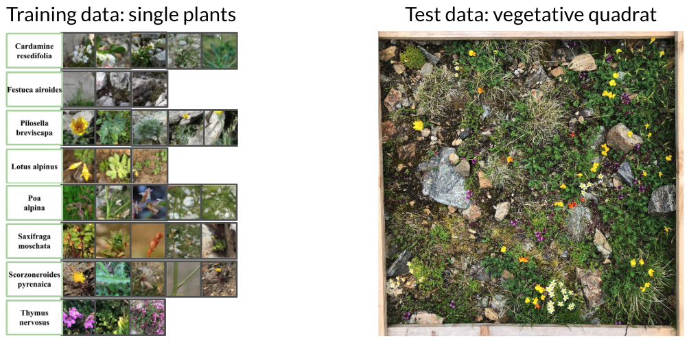 The core of our method is a narrow vision transformer (ViT), which we employ to perform segmentation i.e., discriminate between plant (relevant) and background elements (irrelevant). This ViT is trained to reconstruct class prototypes (clusters) from the training set (containing individual plants) from high-resolution quadrat images (test set). We adapt this model to perform segmentation, by using its attention scores to eliminate the background elements, and then perform classification over the remaining relevant patches - in a decrease and conquer fashion.