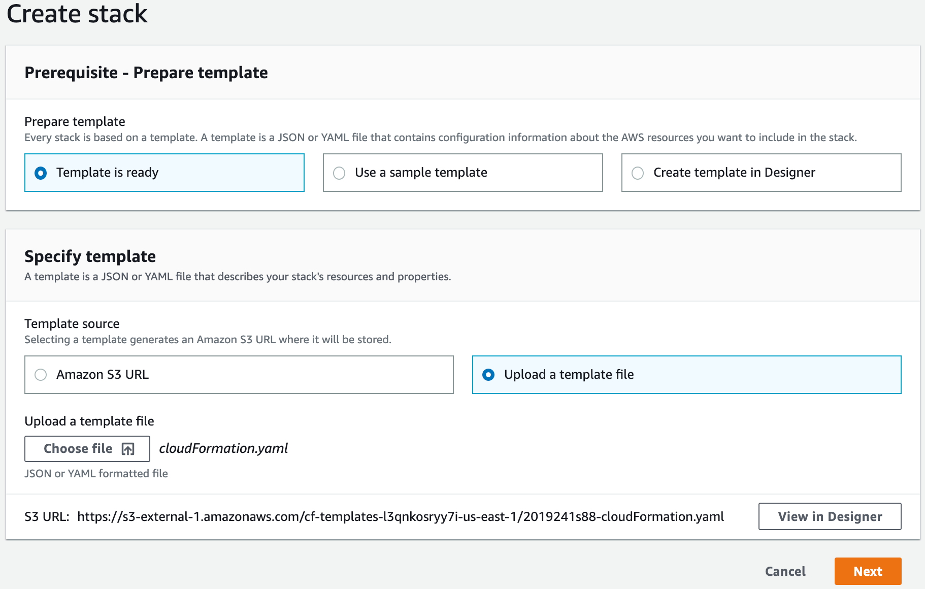 cloudFormation.yamlfile, select it for upload and click 'Next':