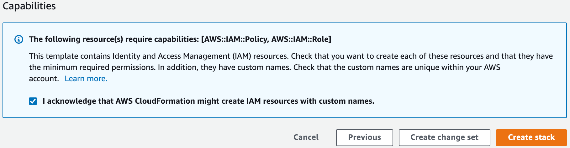 7. After you hit 'Create stack', CloudFormation creates and configures the required resources. You can follow along by clicking the refresh icon in the 'Events' tab. The entire process should take about 2 minutes. 8. After your stack is in the status 'CREATE_COMPLETE', you can switch to the 'Outputs' tab and copy the value of the `EndpointARN` key