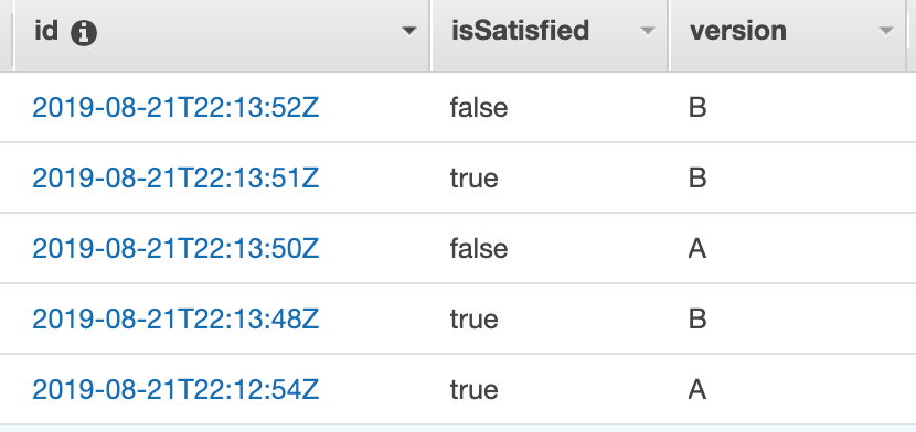 If you invoke it a couple of times, you should get a mix of A and B, depending on the split ration you configured for the router. This behavior wouldn't make sense for a live application, where one user should consistently see the same version - And that's how the router is actually built. Just for demonstration purposes (i.e. to populate the result store with interesting data), this POC assigns a version depending on the session ID instead of the user ID. You can change this behavior by uncommenting line 20 of the router's index.js file.