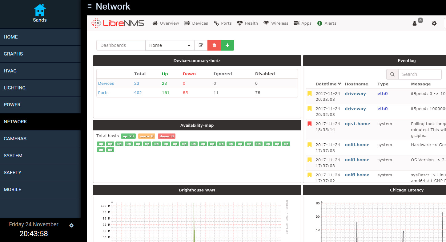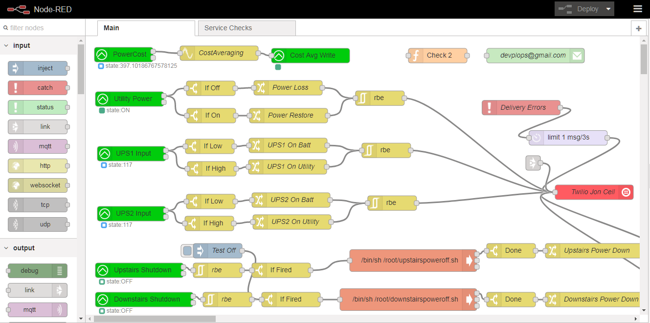 Node-Red is used for additional glue logic, as well as SMS alerts (about fire, smoke, intrusion, loss of power, backup battery statuses, lost services etc) via the Twilio API -