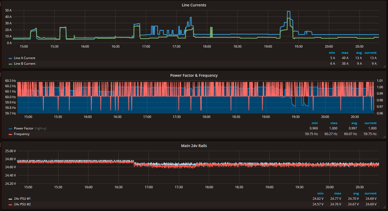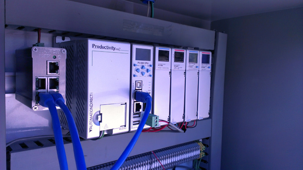 The main design goal was high availability. Everything that can be reasonably duplicated for redundancy has been. There are multiple power supplies for the system fed from multiple power sources as well as a DC UPS system that will keep the entire system powered for 72 hours if all supplies fail simultaneously. The PLC system is networked via ethernet to an HA set of routers (Brocade ICX) - any switch or link can fail with no traffic interruption between the PLC and it's virtualized software parent (OpenHab, Grafana, and Node-Red).