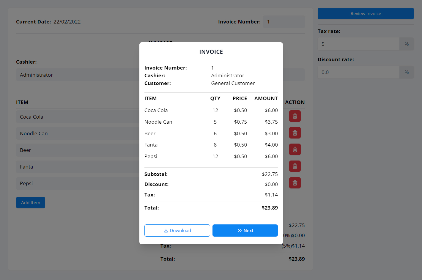 An Invoice Generator project built with React and TailwindCSS. Add items, quantity, prices, tax rates and discounts. Download Generated Invoices as PDFs to your device and print out. Use html-to-image to capture the data from modal and convert it from canvas to pdf with jsPDF.