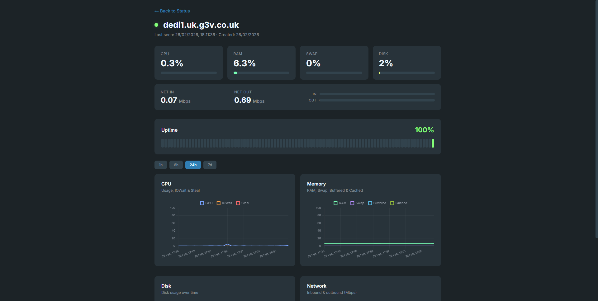 - Real-time monitoring β CPU, RAM, Swap, Disk, Network IN/OUT with live-updating bars