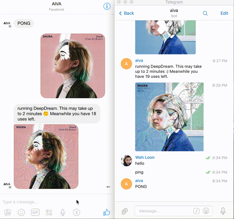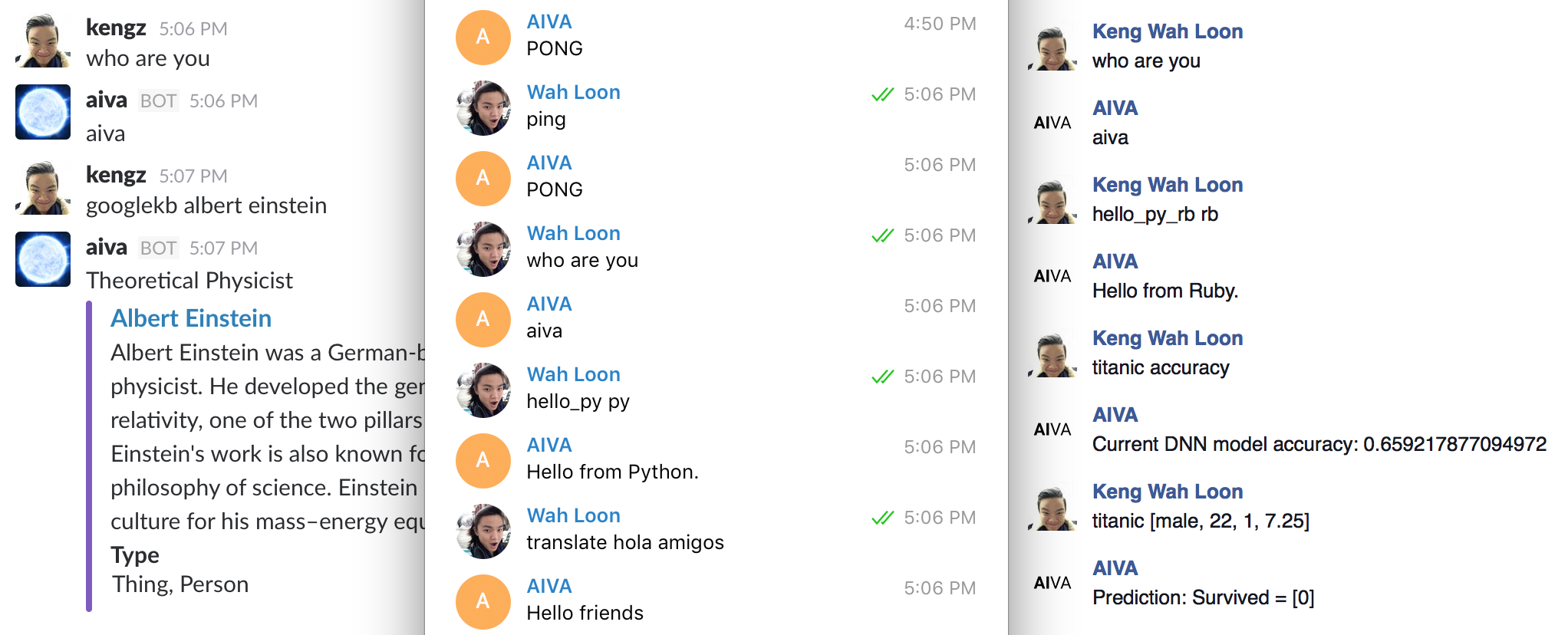 AIVA saying hi, translating, running deep neural net; on Slack, Telegram, Facebook: