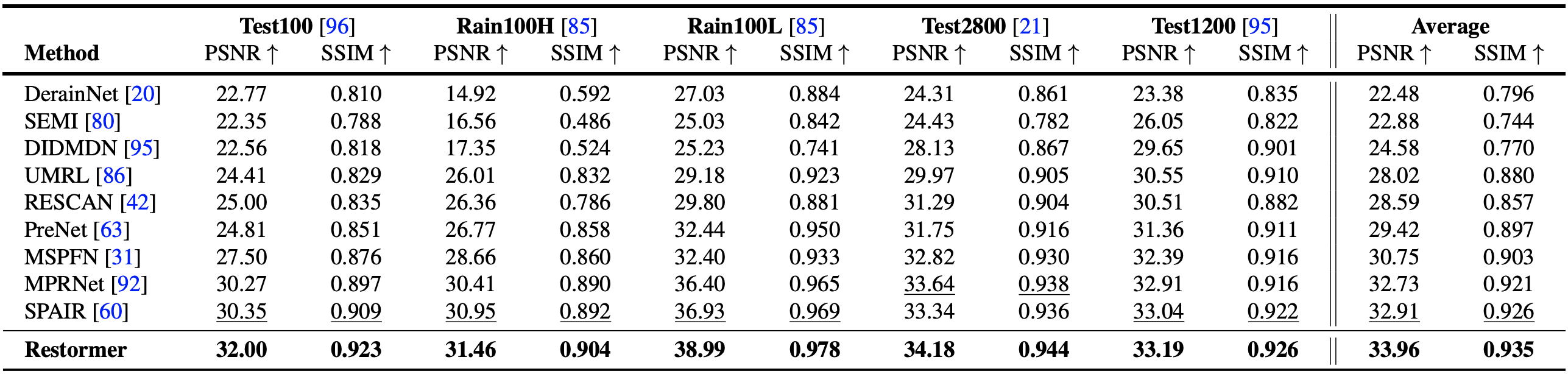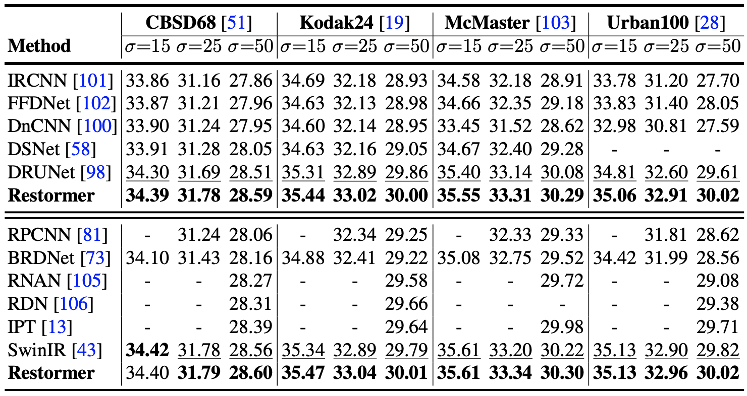 Training and Testing instructions for Deraining, Motion Deblurring, Defocus Deblurring, and Denoising are provided in their respective directories. Here is a summary table containing hyperlinks for easy navigation: