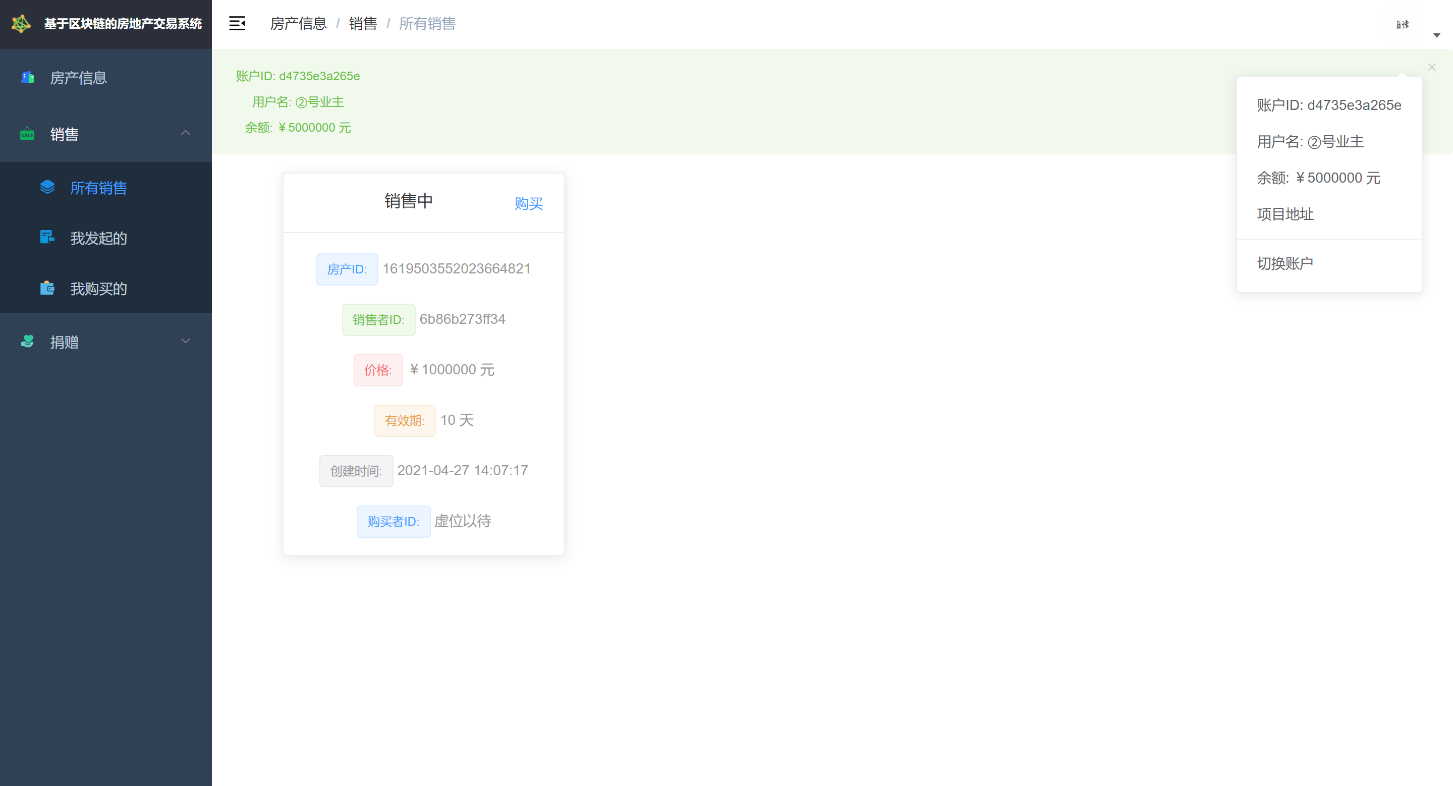 业主发起销售,所有人都可查看销售列表,购买者购买后进行扣款操作,并等待业主确认收款,交易完成,更新房产持有人。在有效期期间可以随时取消交易,有效期到期后自动关闭交易。