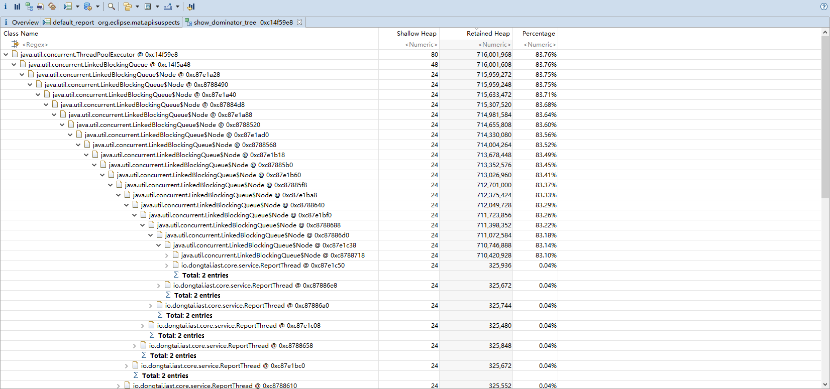 One instance of "java.util.concurrent.ThreadPoolExecutor" loaded by "" occupies 716,001,968 (83.76%) bytes. The instance is referenced by classloader/component. "io.dongtai.iast.agent.IastClassLoader @ 0xc0f875f8".