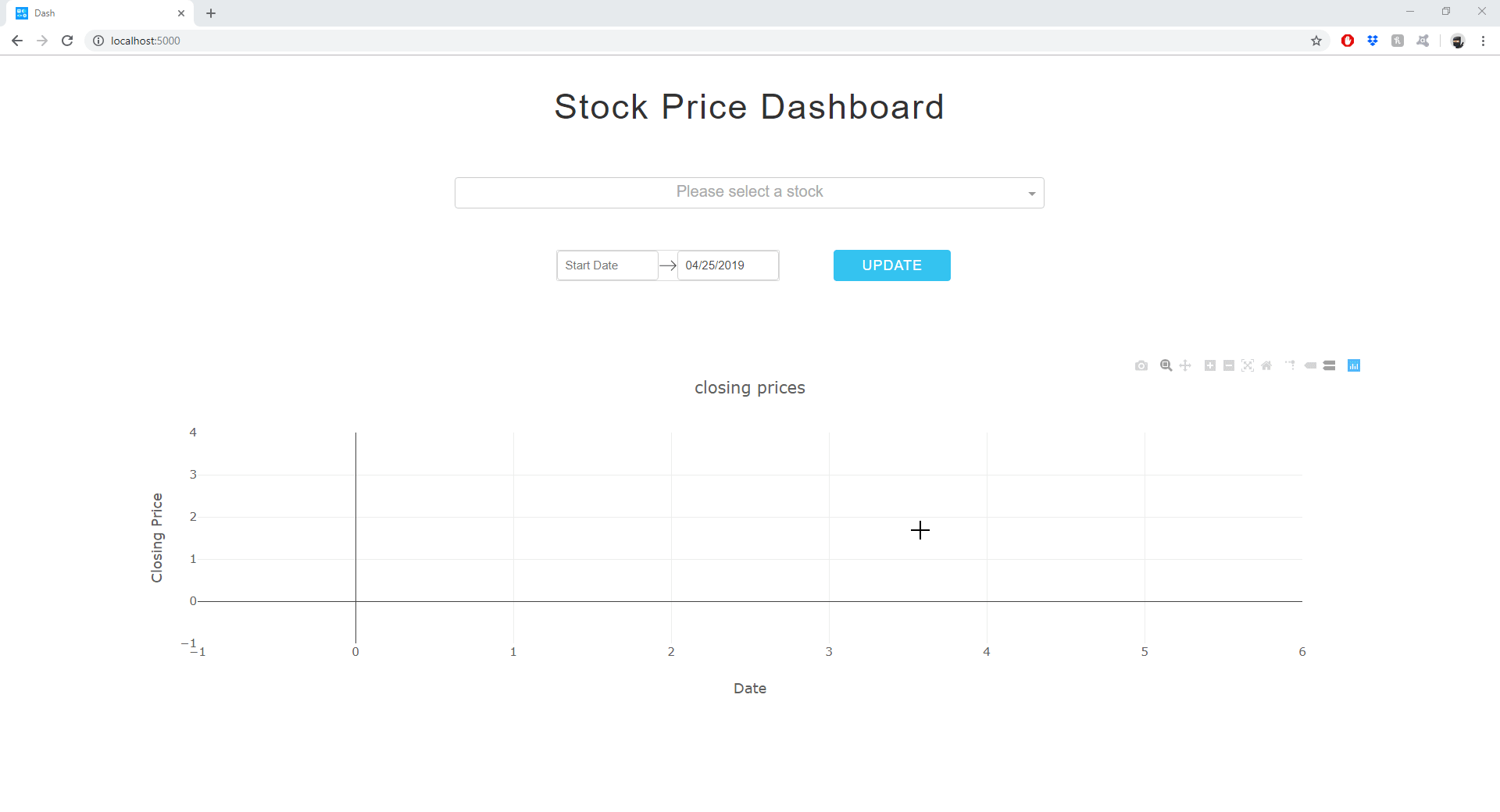 An interactive stock price dashboard which displays upto 5 years of historic stock data. The user can select one or more stock symbols to view at once. The dropdown shows all stock symbols supported for trading by the Investor’s Exchange. Functionality such as zooming, hovering, toggling and dynamic updating is supported for all plots.