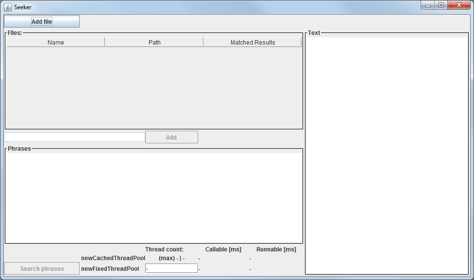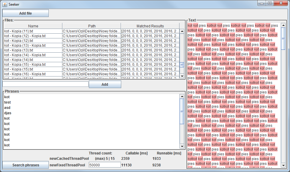 The application is intended for searching multiple phrases in multiple text files simultaneously. Is compares implementation of Runnable and Callable interfaces and methods of Executors class: newFixedThreadPool(int) and newCachedThreadPool().