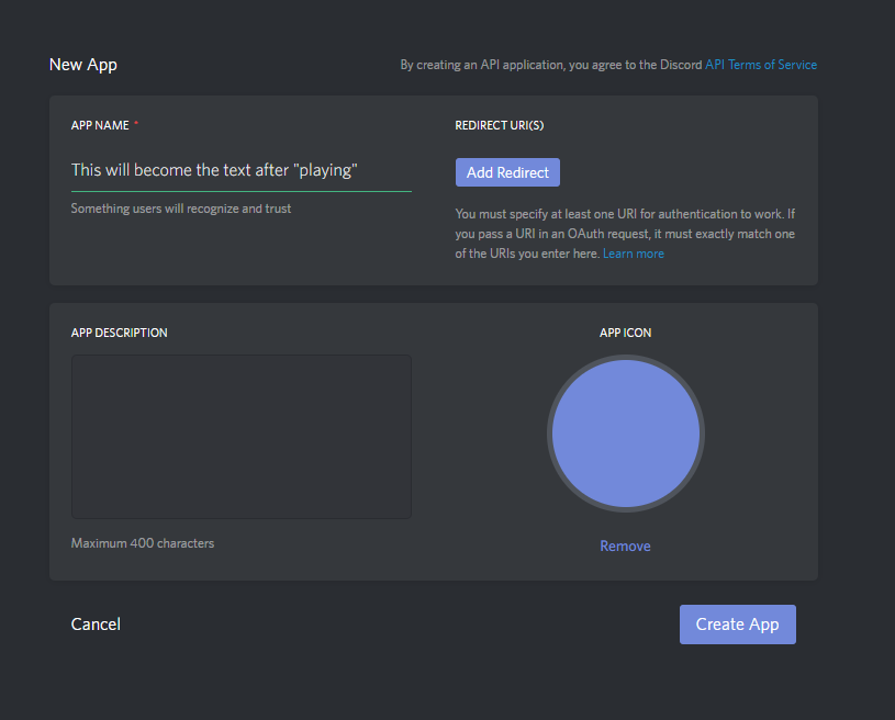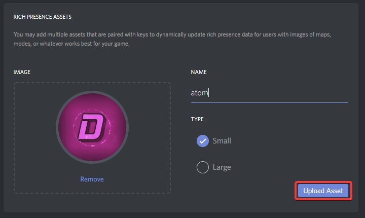 To change the "Playing Atom Editor" text you will need to make a new discord developer application, you can do this by repeating the following steps: