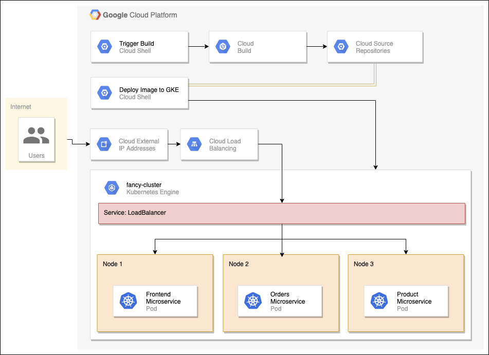 $ kubectl delete service <SERVICE_NAME>- Google Cloud Build can be used to build the Docker container and put the image in the Container Registry.