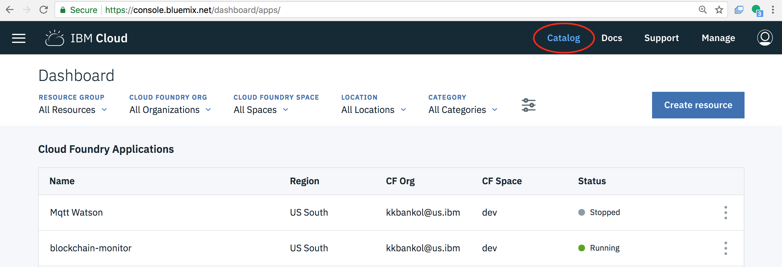 Navigate to the IBM Cloud dashboard at https://console.bluemix.net/ and click the "Catalog" button in the upper right