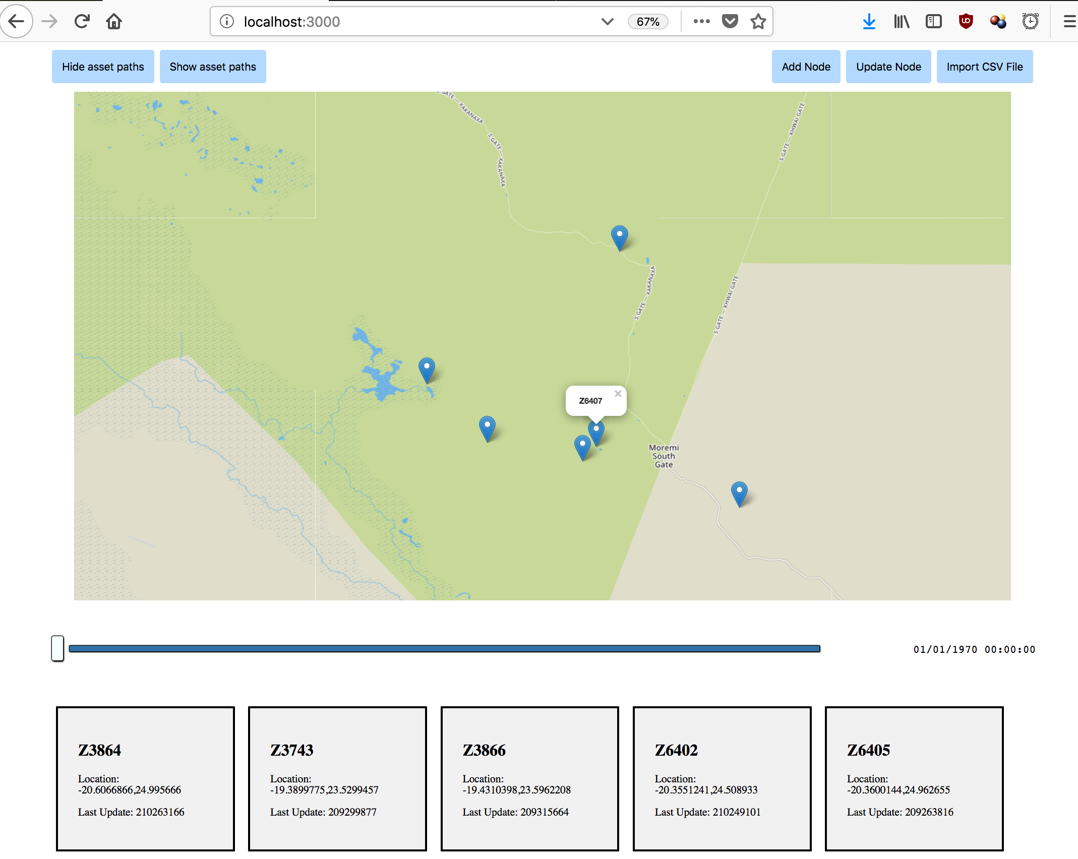 We can also bulk import CSV datasets. In this example, we'll use data from tracking a herd of zebra in Botswana, which can be downloaded here. This file can be loaded by clicking the "Import CSV File" button.