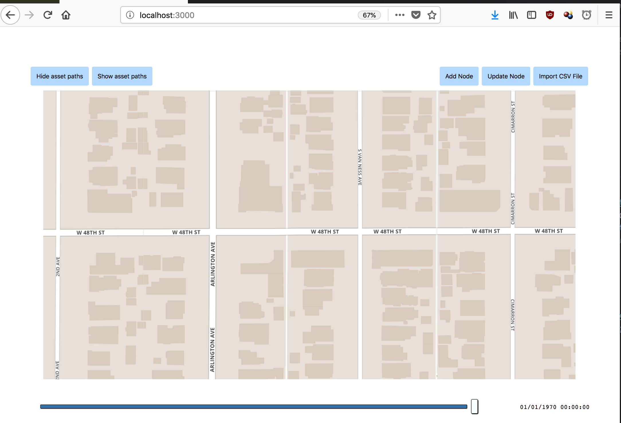 If there are multiple datapoints associated with an asset, we can use a "range slider" to trace back and view an assets path. As the slider is adjusted, each marker should update their location and sensor identifier. Also, the corresponding timestamp should be shown in the bottom right corner of the map.
