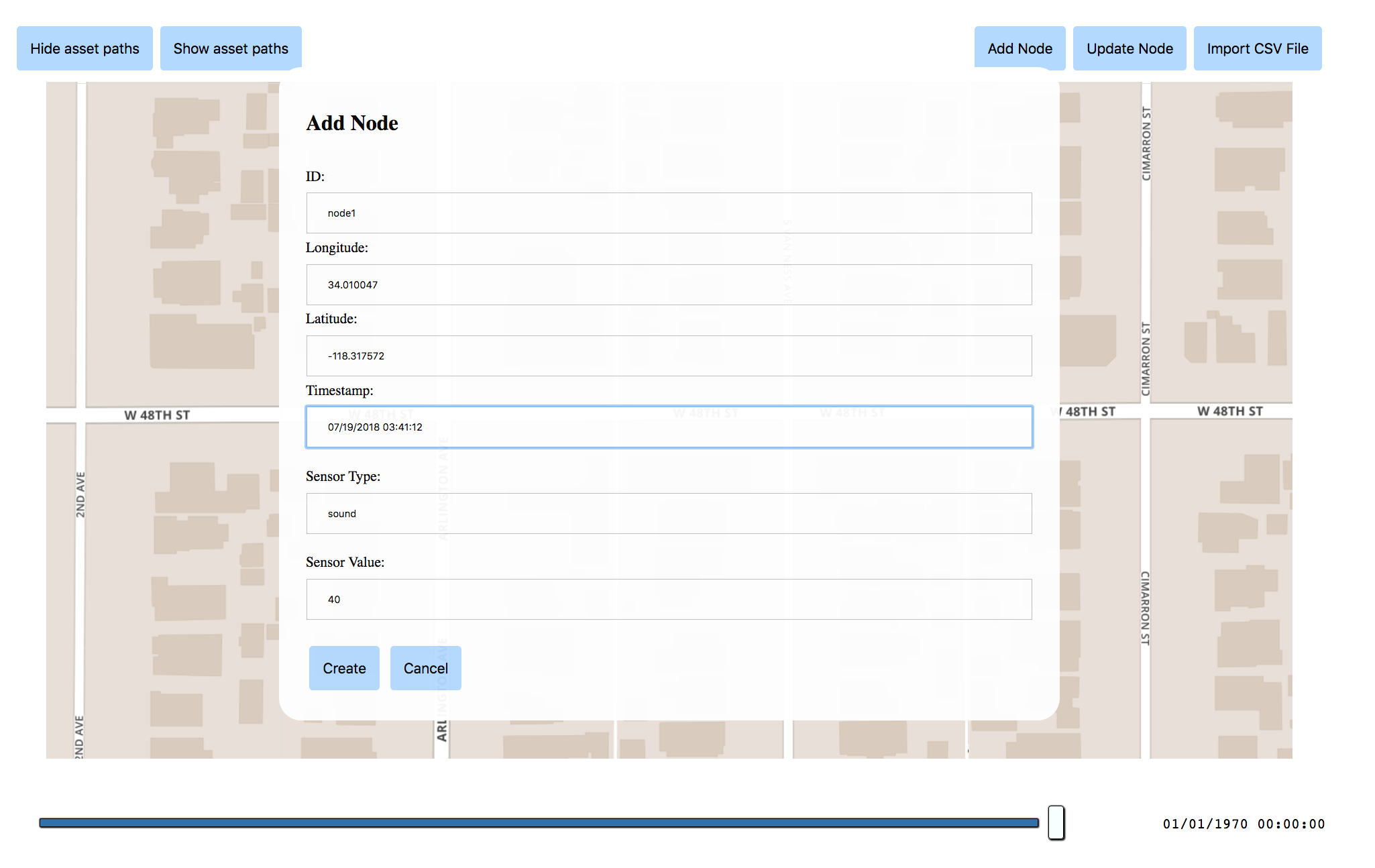 The first option is to create a node manually. This can be done by clicking the "Add Node" button and entering the required values. Once they have been entered, pressing "Create" should render a marker like so. A transparent circle will also be added if a sensor is provided, and the radius length is determined by the sensor value