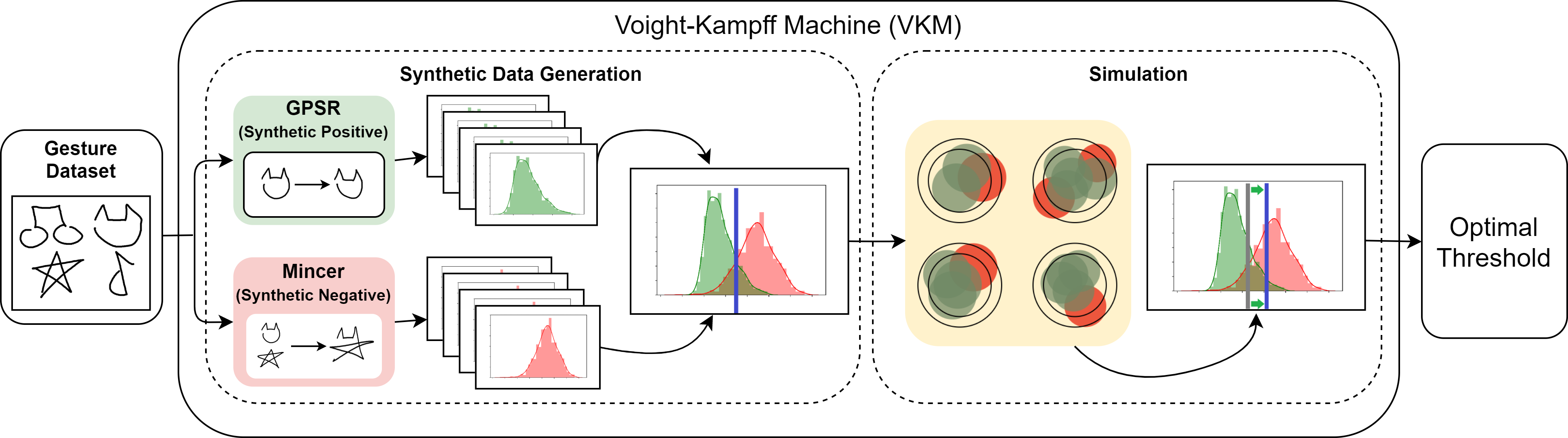 $ python main.pyFor the publication, we evaluated VKM as part of a continuous data processing pipeline, to which we refer to as The Dollar General (TDG) [4]. TDG consists of device-agnostic gesture recognition techniques, and its main components are: Machete [2], which proposes regions that might be gestures; Jackknife [1], which classifies the proposed regions; VKM [this work], which rejects input that does not cross the similarity threshold. To learn more about this research and for technical details on the approach, please refer to the following: