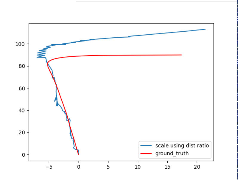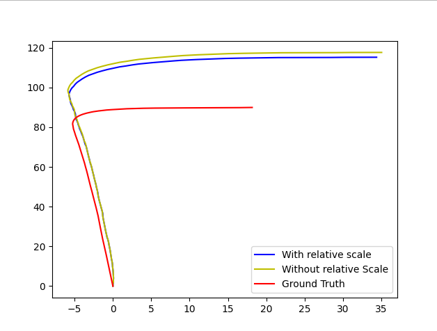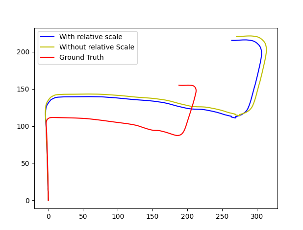 - Relative scale was computed by taking the mean of distances between the consecutive points clouds obtained from keypoint matching of subsequent images and rescale translation accordingly.
