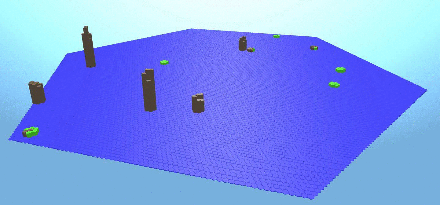 This is a simple random terrain generator that uses a hex based grid. Every object is a hexagon tile with a different color and height.