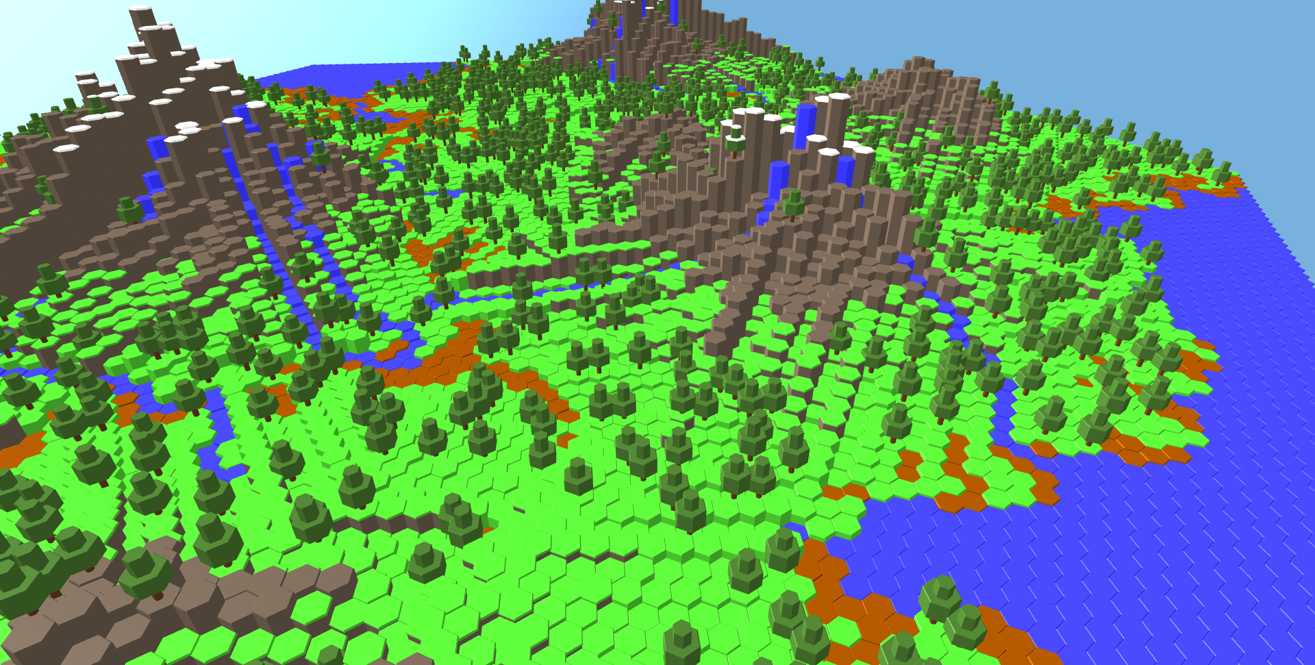 Right now there are 2 types of bioms - mountain and flat island. There are rivers flowing from the mountains and the higher tiles are covered in snow. Trees are spawned on the grass and mountain tiles.