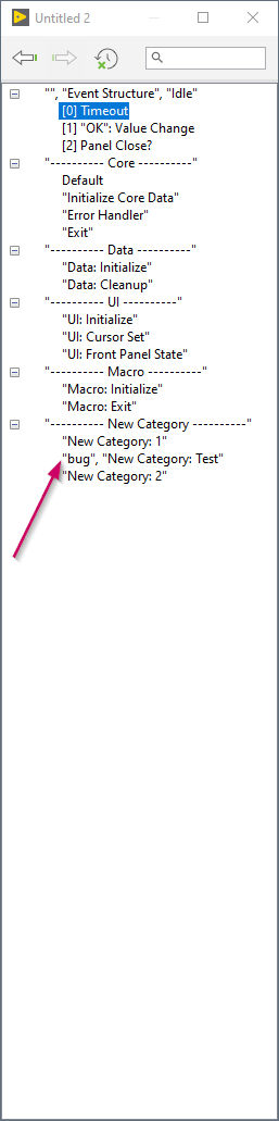 Right-click on JKI SM Explorer -> Insert New Frame -> "New category: Test, bug" -> explorer jumps to default "", "Event Structure", "Idle" case page -> and also new case page "bug", "New Category: Test" is created.