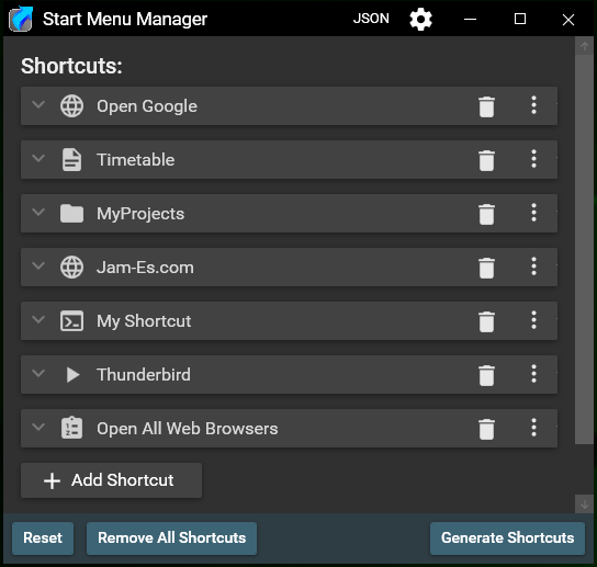 The StartMenuManager.GUI project contains the main WPF application. StartMenuManager.Builder is a console app which creates the shorcuts a from JSON file. StartMenuManager.Runner is a console app used to run the Shortcuts when they are clicked. There are a few other class libraries, a project which acts as an uninstallation step, and an Wix installer project.