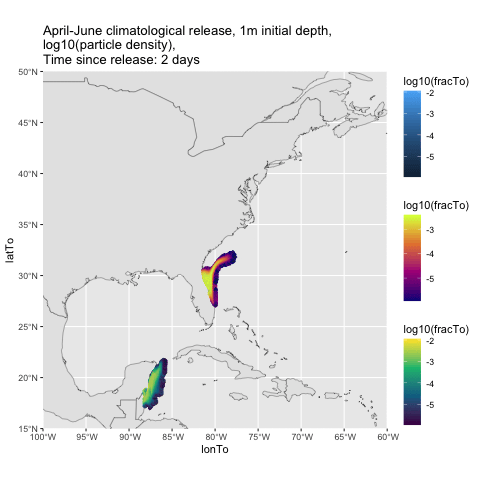 Climatological dispersal of particles released from Quintana Roo, Mexico, and the East Coast of Florida, USA in April, May and June, and allowed to disperse for 18 days. Particles released at 1m, can vary in depth subsequently. Colors represent log of fraction of particles released which reach a point. Code to produce this plot is in code directory, and is in two files: animate_DispersalData_from_two_Regions.Rmd and save_DispersalData_fromRegion.R in code/code_for_README.md_graphics/.