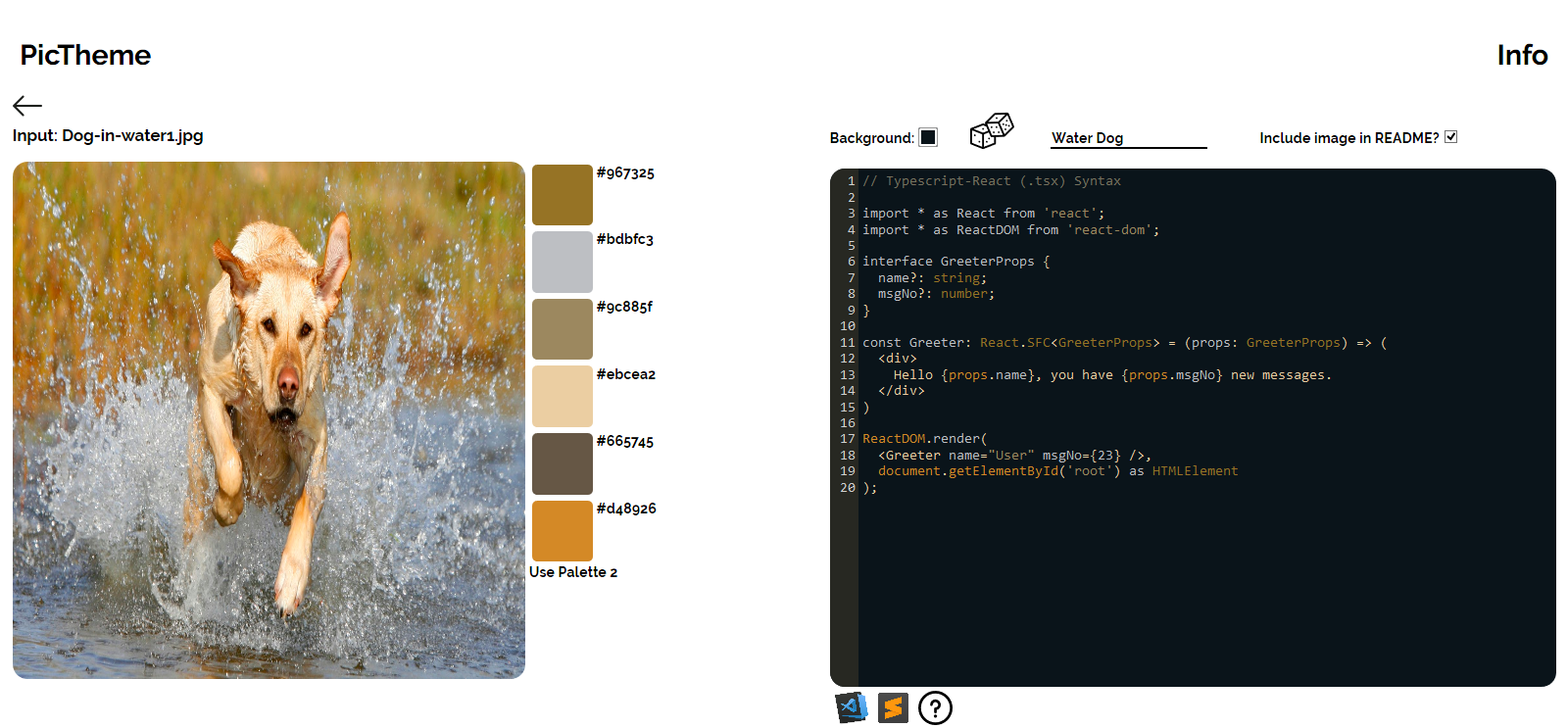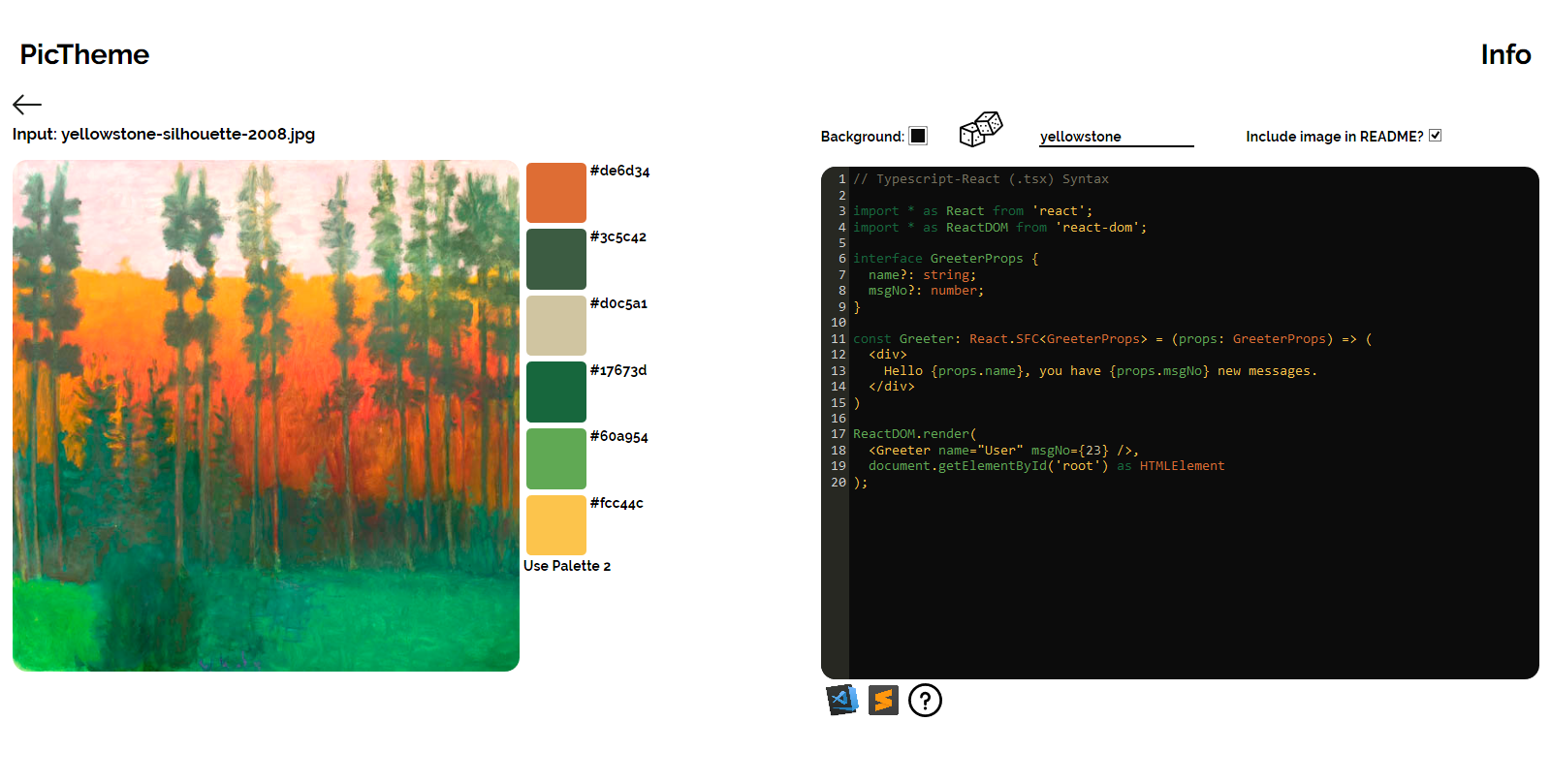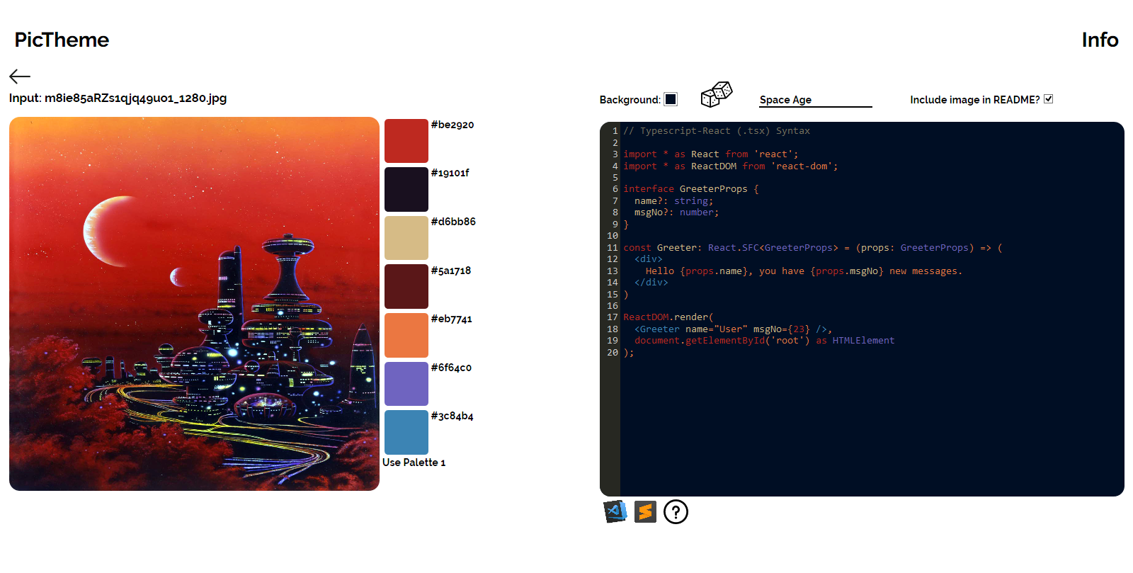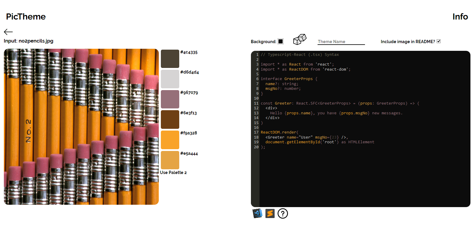 PicTheme uses the color palettes from images to generate color themes for VS Code and Sublime text. It generates two palettes, each generated with a different image library. The first is generated using splashy, and the second with get-image-colors. It also generates a README file that includes the image the PicTheme is based upon. It's made with React/Redux on the front end and Express.js on the back end. Typescript is used throughout the application. It also uses Docker for containerization and is hosted on Heroku.