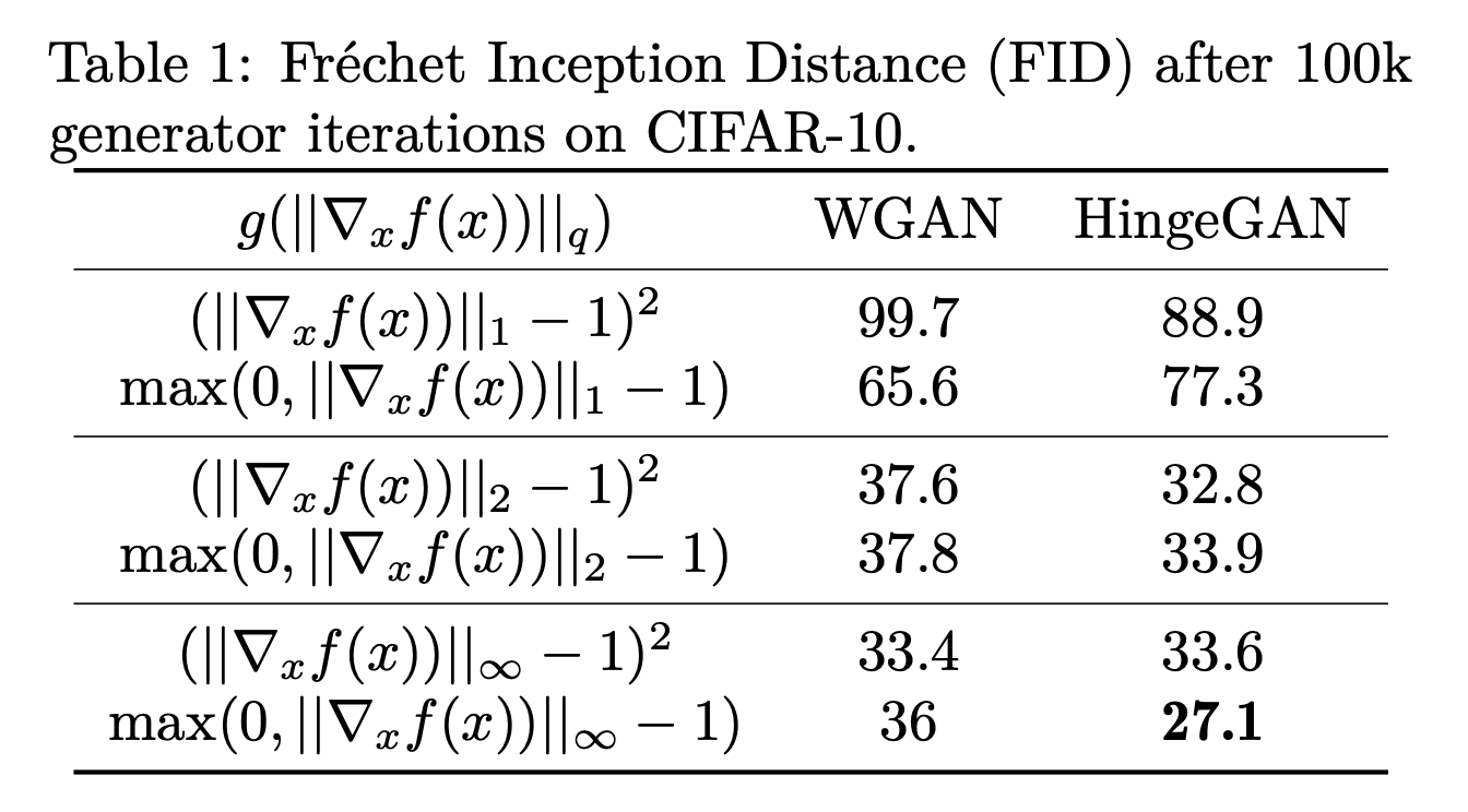 結果は理論的帰結から得られたものと同じく、L∞勾配正則化とHinge Lossの組み合わせで最も低いFIDスコアになった。