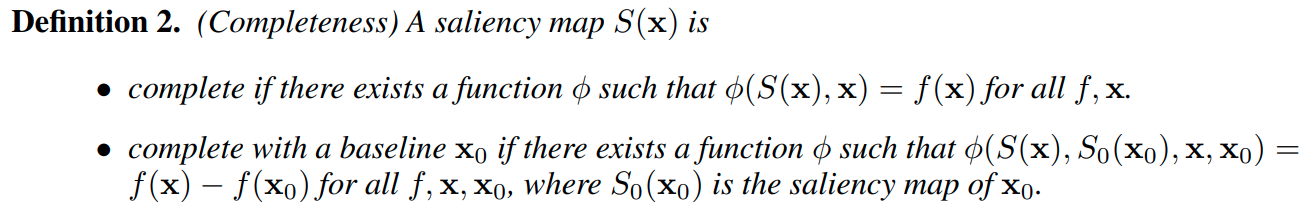 ざっくり言えば、S(x)はモデル fの計算を完全に捉えた表現になっていなければならないこと、すなわちsaliency map S(x) と入力 xによって fが復元されることを保証するものがcompleteness(完全性)である。 -