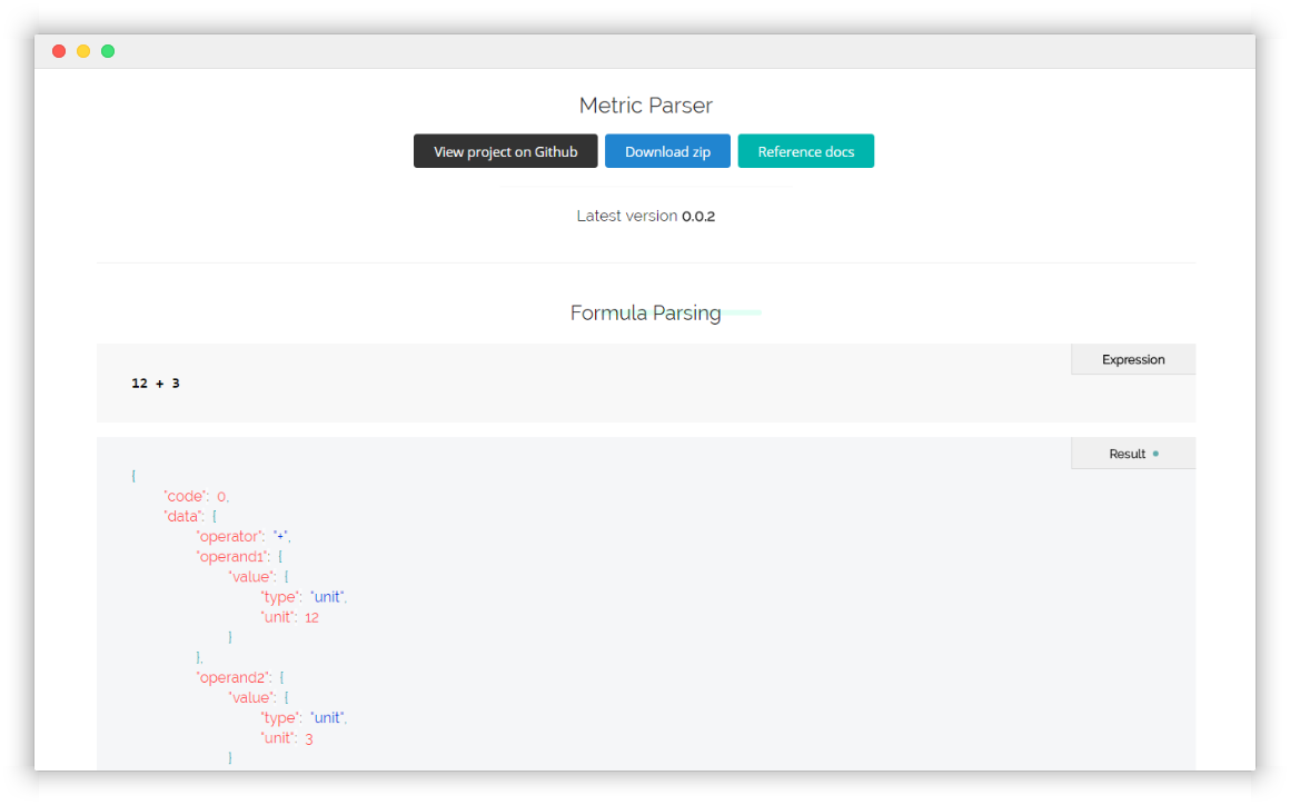 $ git clone [email protected]:KennethanCeyer/metric-parser.git$ npm install metric-parser$ yarn add metric-parser<script src="~/dist/metric.parser.umd.js"></script>