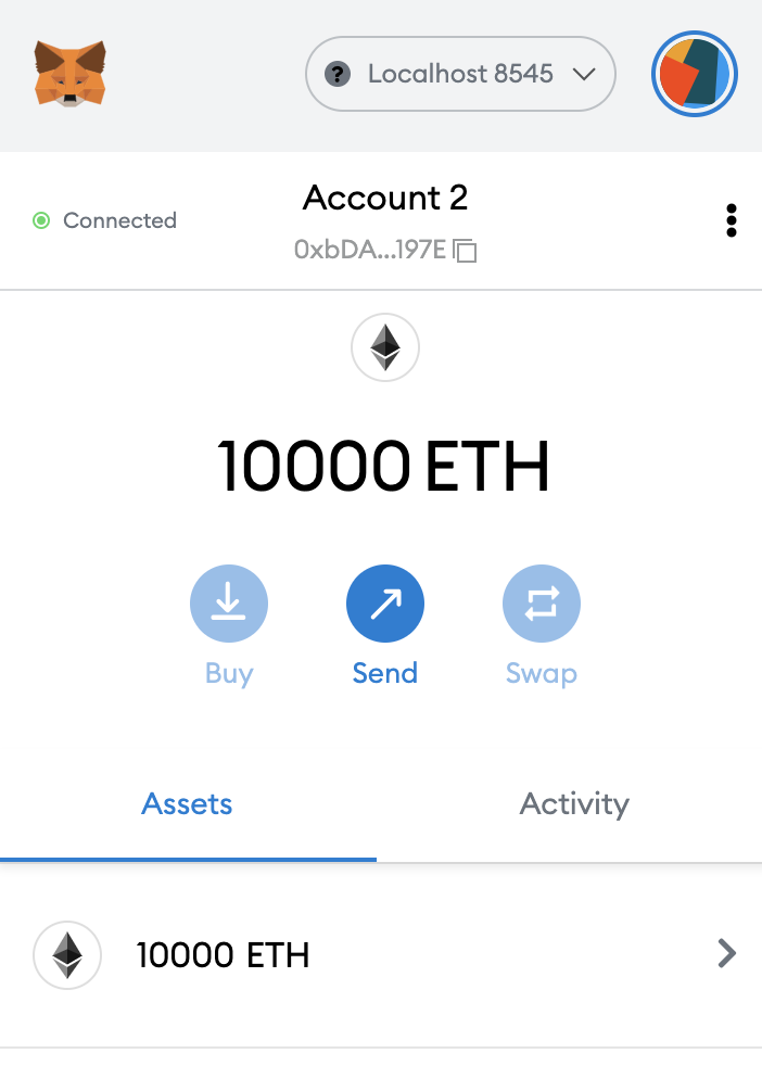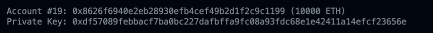 Account #0: 0xf39fd6e51aad88f6f4ce6ab8827279cfffb92266 (10000 ETH) Private Key: 0xac0974bec39a17e36ba4a6b4d238ff944bacb478cbed5efcae784d7bf4f2ff80